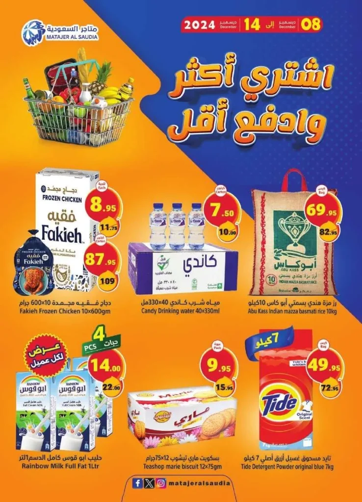 عروض متاجر السعودية الأحد 8 ديسمبر 2024 تتميز بتقديم مجموعة واسعة من العروض المذهلة التي تلبي جميع احتياجات الأسرة و تشمل هذه العروض تخفيضات كبيرة على المنتجات الغذائية مثل الأرز الفاخر بمختلف أنواعه وزيوت الطهي الصحية بالإضافة إلى تخفيضات مميزة على منتجات الألبان والحبوب بأسعار تنافسية.
