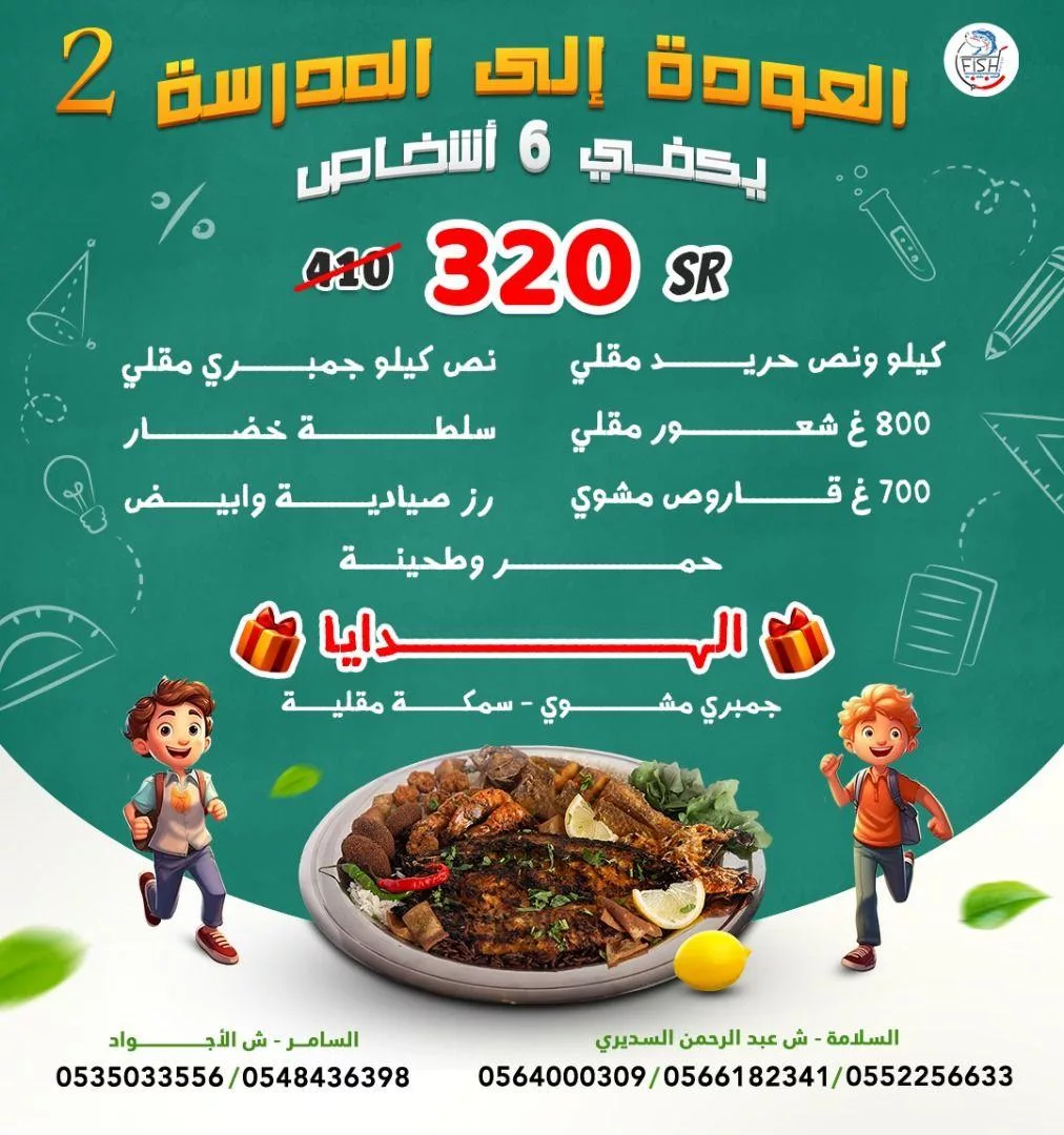 للاحتفال بالعودة إلى المدارس، يقدم مطعم سوق السمك الطازج عرضًا مميزًا يكفي لستة أشخاص بمبلغ 320 ريال سعودي بدلًا من 450 ريال سعودي. يشمل هذا العرض المكونات التالية: