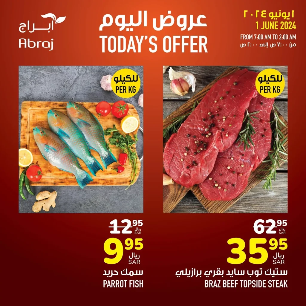 عروض أبراج هايبر ماركت السبت 1 يونيو 2024 تقدم لكم اليوم تشكيلة رائعة من المنتجات الغذائية التي تشمل السمك الطازج واللحوم ذات الجودة العالية مثل سمك الحريد وستيك توب سايد بقري برازيلي. كما يمكنكم الاستفادة من الخصومات المميزة على المنتجات المنزلية مثل طقم مفرش سرير ومكواة بخار كهربائية،