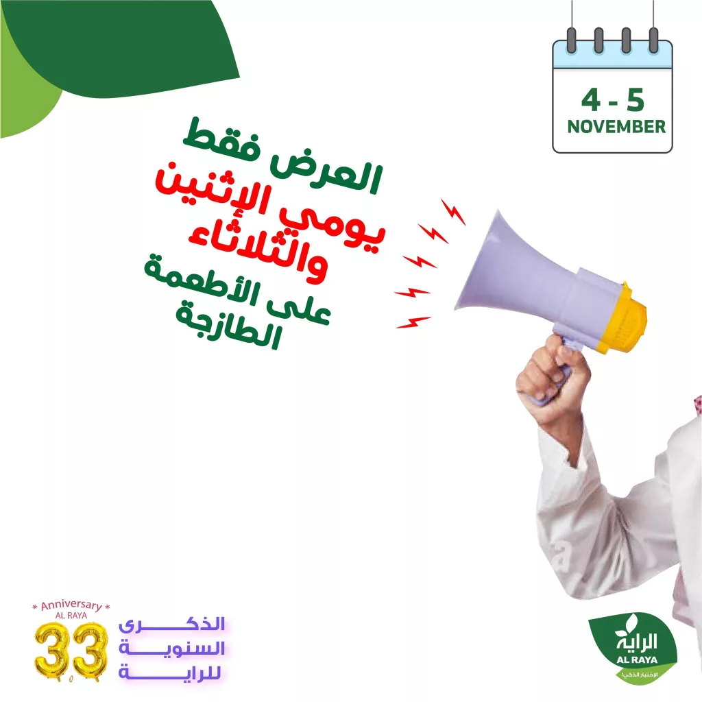 تقدم أسواق الراية تشكيلة مميزة من العروض في قسم الأغذية الطازجة حيث تشمل التخفيضات تشكيلة متنوعة من المخبوزات الطازجة يوميا إلى جانب منتجات اللحوم والدواجن ذات الجودة العالية لتضمن لعملائها الاستمتاع بأفضل المنتجات بأفضل الأسعار و تشمل هذه العروض أصنافا مختلفة من المخبوزات والمناقيش الطازجة