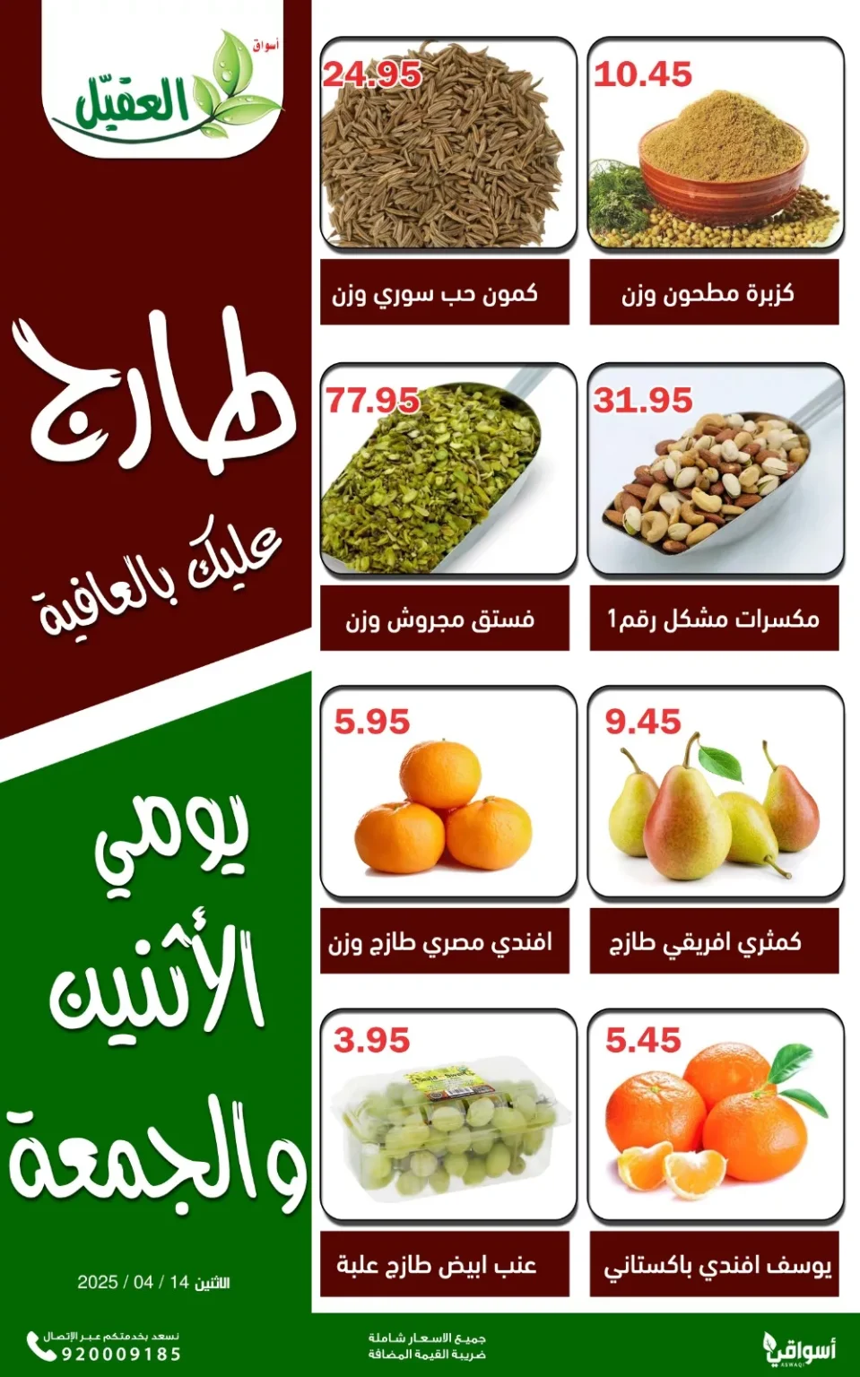 عروض أسواق العقيل يشمل العرض تشكيلة واسعة من المنتجات الموسمية التي تُعرض يومي الإثنين والجمعة مما يمنح المتسوقين فرصة ذهبية لاقتناء ما يحتاجونه بأسعار مخفضة يمكن للمتسوقين الاستفادة من الأسعار الخاصة على المكسرات الطازجة والخضروات اليومية والفواكه المختارة