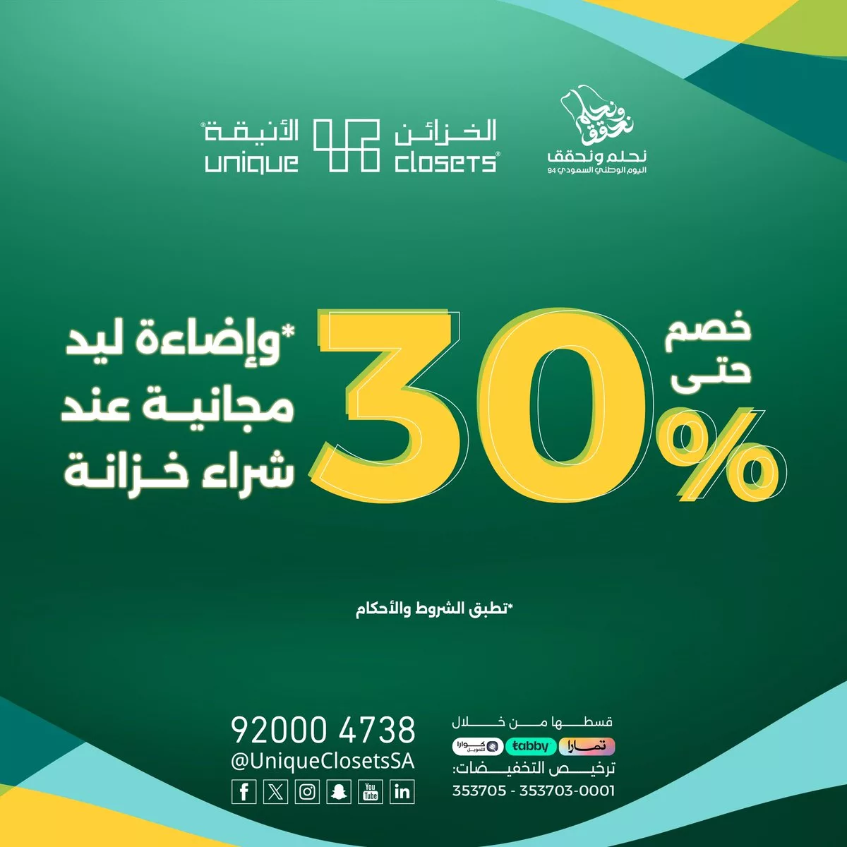 تقدّم شركة Unique Closets عرضًا خاصًا ومميزًا بمناسبة اليوم الوطني السعودي، حيث يمكنك الاستفادة من خصم يصل إلى 30% على جميع منتجات خزائن الملابس الأنيقة. يتميز هذا العرض بالتصاميم العصرية والجودة العالية وأحدث تقنيات التركيب التي تضمن استخدامًا مريحًا ومستدامًا.