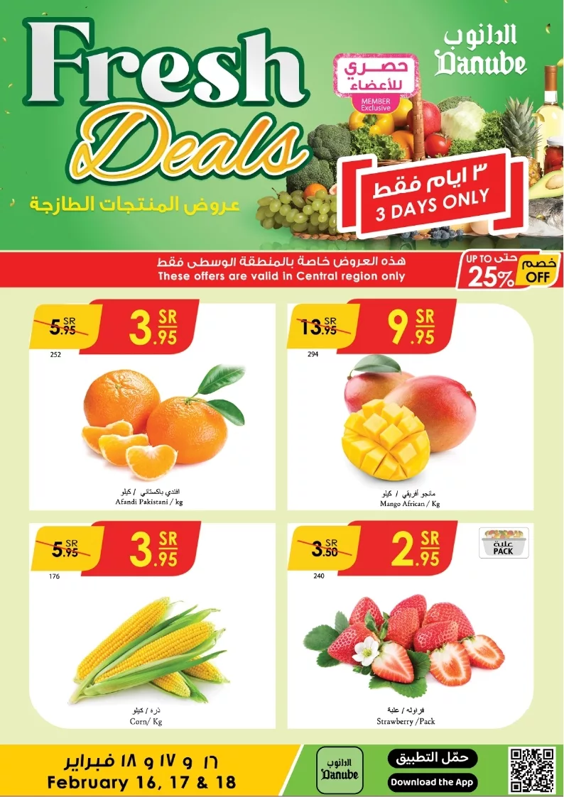 عروض الدانوب الرياض الاحد 16-2-2025 توفر لكم تشكيلة واسعة من المنتجات الطازجة بأسعار مذهلة حيث تشمل الخصومات على الخضروات والفواكه مثل البصل الأبيض و الكوسة و المانجو الأفريقي واليوسفي الباكستاني كما تتوفر الذرة والفراولة الطازجة بأسعار مخفضة
