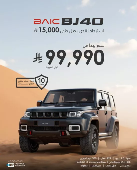 عرض سيارة بايك BJ40 من بايك السعودية ليقدم مزيجًا من القوة والتقنيات الحديثة بسعر تنافسي يبدأ من 99,990 ريال قبل الضريبة، بالإضافة إلى استرداد نقدي يصل حتى 15,000 ريال، مما يجعله من أقوى العروض المطروحة حاليًا في سوق السيارات بالمملكة