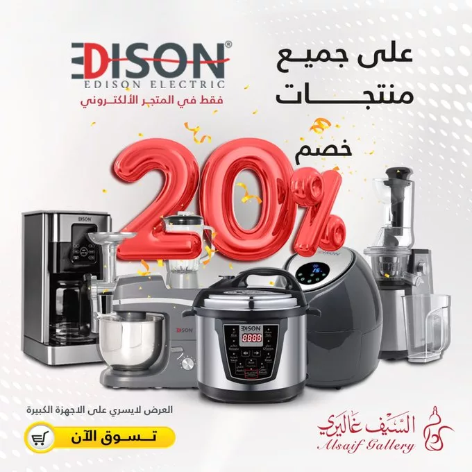 السيف غاليري يقدم عرضًا استثنائيًا يشمل خصمًا بنسبة 20% على جميع منتجات إديسون، باستثناء الأجهزة الكبيرة، مما يجعلها فرصة مثالية للعملاء لتجديد أدواتهم وأجهزتهم المنزلية بأسعار مخفضة. هذا العرض متاح حصريًا عبر المتجر الإلكتروني والتطبيق، مما يوفر للعملاء الراحة والسهولة في التسوق من المنزل أو أي مكان آخر. منتجات إديسون المعروضة تشمل مجموعة متنوعة من الأجهزة الصغيرة والأدوات المنزلية التي تتميز بجودتها العالية وتصاميمها العصرية، والتي تناسب كل مطبخ أو منزل.