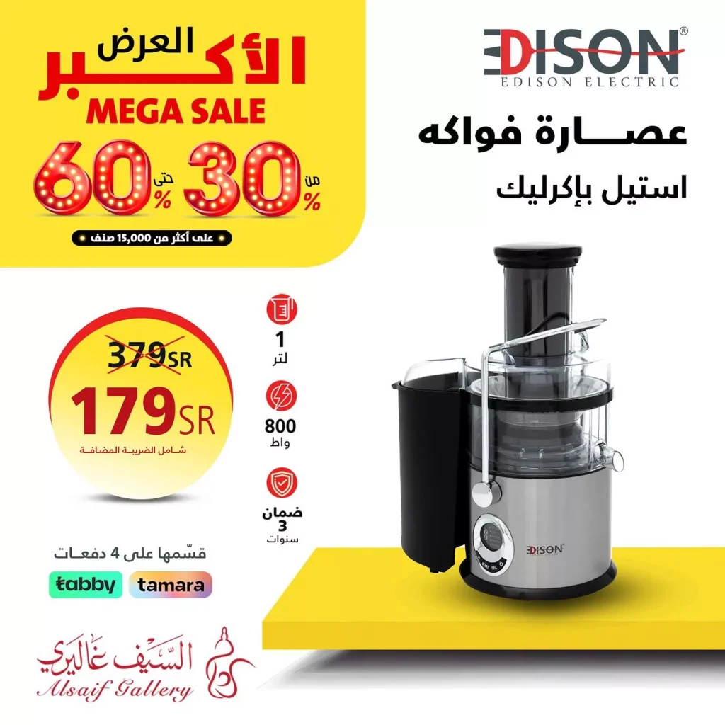 تتميز عروض السيف غاليري بتقديم مجموعة واسعة من الأجهزة الكهربائية المنزلية التي تلبي احتياجات جميع أفراد الأسرة. تتضمن هذه العروض منتجات إيدسون الكهربائية ذات الجودة العالية والتي تشمل طاهية البيض الكهربائية الرمادي، عصارة الفواكه استيل بإكريليك، ومايكرويف قلاية هوائية.