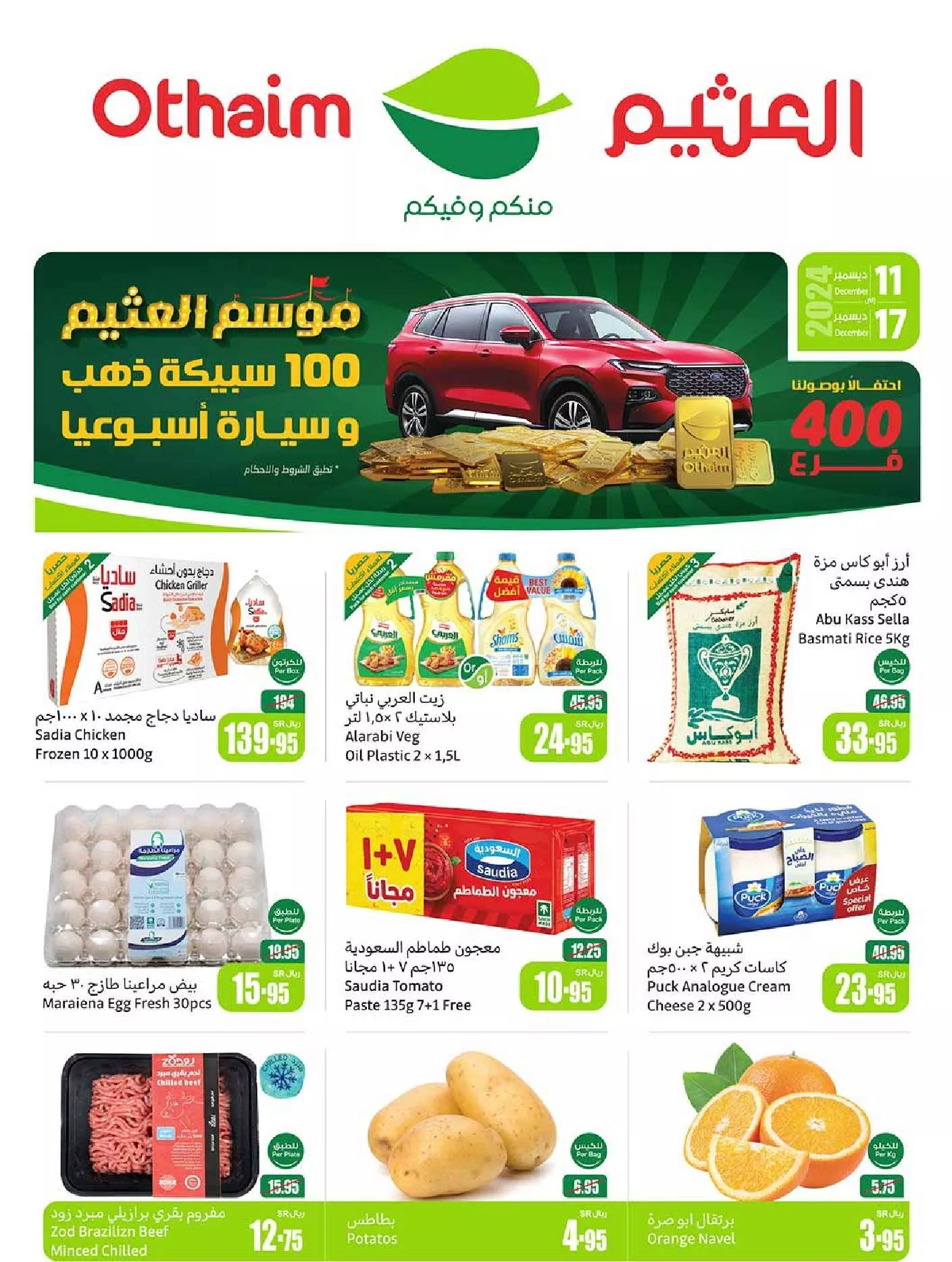 عروض العثيم الأسبوعية الأربعاء 11 ديسمبر 2024 توفر تخفيضات مذهلة على مختلف الأقسام التي تلبي كافة الاحتياجات اليومية و تشمل العروض خصومات على اللحوم المفرومة و الدواجن المعبأة والمأكولات البحرية إلى جانب السلع التموينية الأساسية مثل الأرز و المعكرونة والزيوت النباتية باقل الاسعار