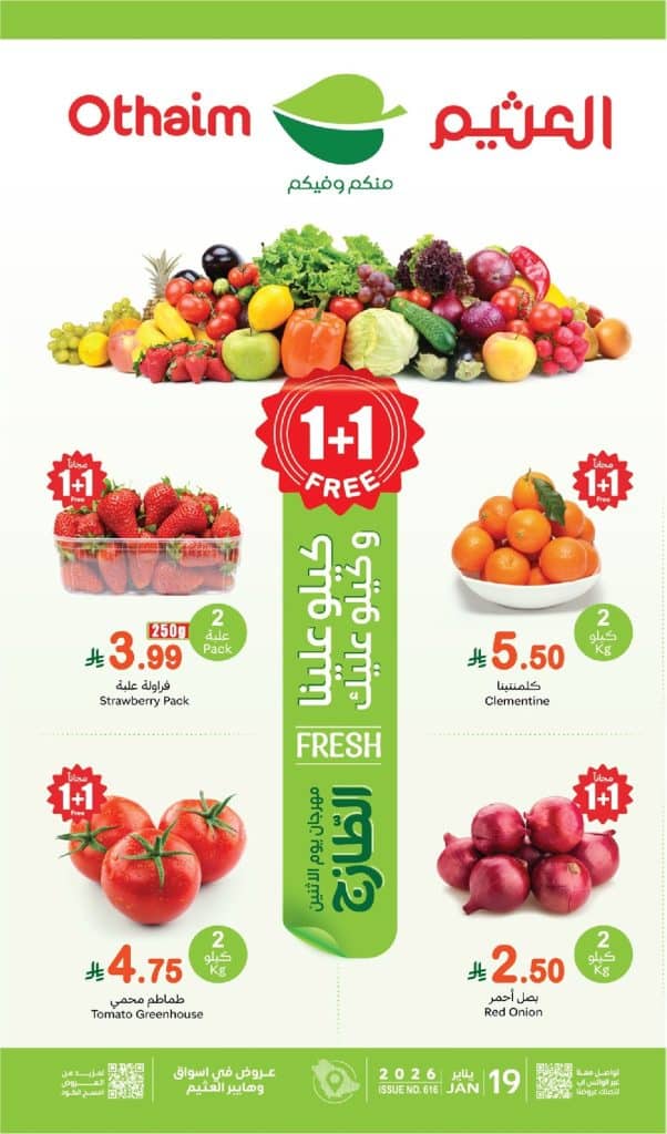 تتميز عروض العثيم دائماً بتنوعها وقدرتها على تلبية احتياجات جميع أفراد الأسرة. هذا الأسبوع، يركز المهرجان على توفير أجود أنواع المنتجات الطازجة بأسعار تنافسية للغاية. سواء كنت تخطط لإعداد وجبة عشاء شهية، أو تحضير فطور صحي، أو ببساطة تجديد مخزونك الأسبوعي، فإن عروض العثيم تقدم لك كل ما تحتاجه وأكثر. بالإضافة إلى ذلك، لا تفوت فرصة الاستفادة من عروض “اشترِ 1 واحصل على 1 مجاناً” على العديد من المنتجات المختارة.