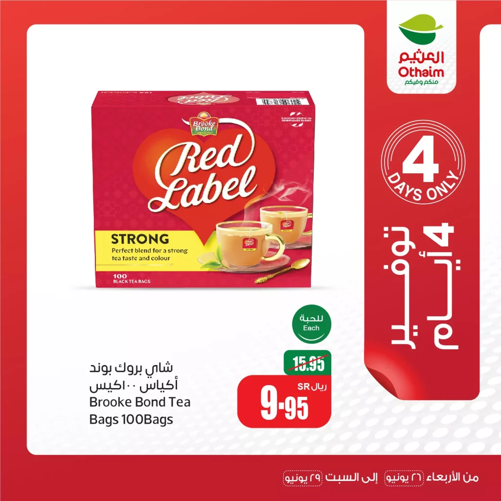 - الوصف: شاي قوي ومركز، مثالي لتحضير كوب شاي مثالي بأقل جهد، يأتي في عبوة اقتصادية تحتوي على 100 كيس شاي.