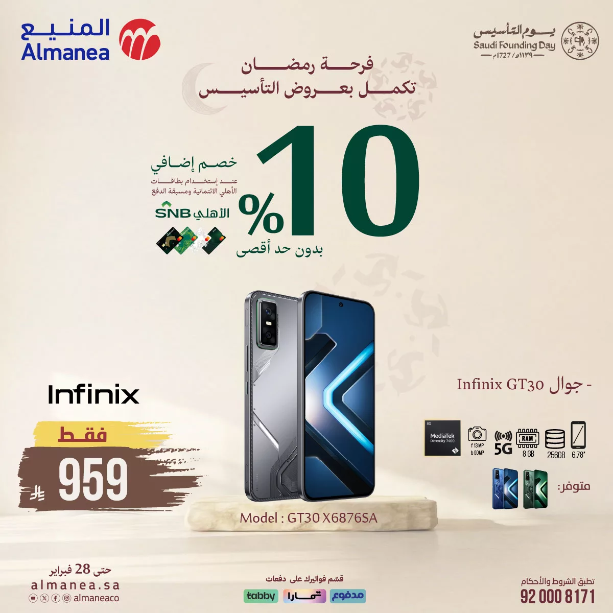 لا تدع هذه الفرصة الذهبية تفوتك! عروض المنيع على الجوالات بمناسبة يوم التأسيس، بالإضافة إلى الخصم الإضافي الرائع مع البنك الأهلي، هي فرصة استثنائية لتحديث هاتفك الذكي بأفضل الأسعار. تأكد من زيارة المنيع أو موقعهم الإلكتروني خلال الفترة من 16 إلى 28 فبراير 2026 للاطلاع على كافة التفاصيل واختيار هاتفك الجديد.
