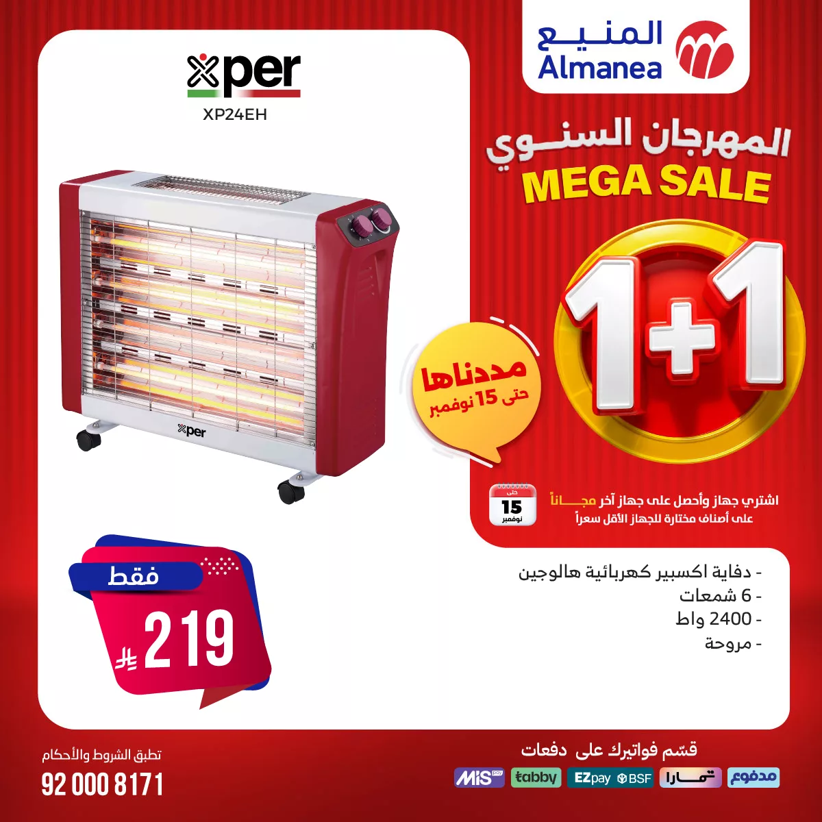 نقدم لكم احدث عروض المنيع و تستمر حتي السبت 15-11-2025 في عرض حصري 1+1 مجانا و تشمل علي مروحة مدمجة وقلاية هوائية بسعة و كذلك قلاية كينوود سطح تيرم وأفران كلفينيتور بالاضافة الي ساعات حديثة و باقل الاسعار في المهرجان السنوي لدي المنيع فقط تابعونا ليصل اليكم كل جديد عن عروض السعودية .