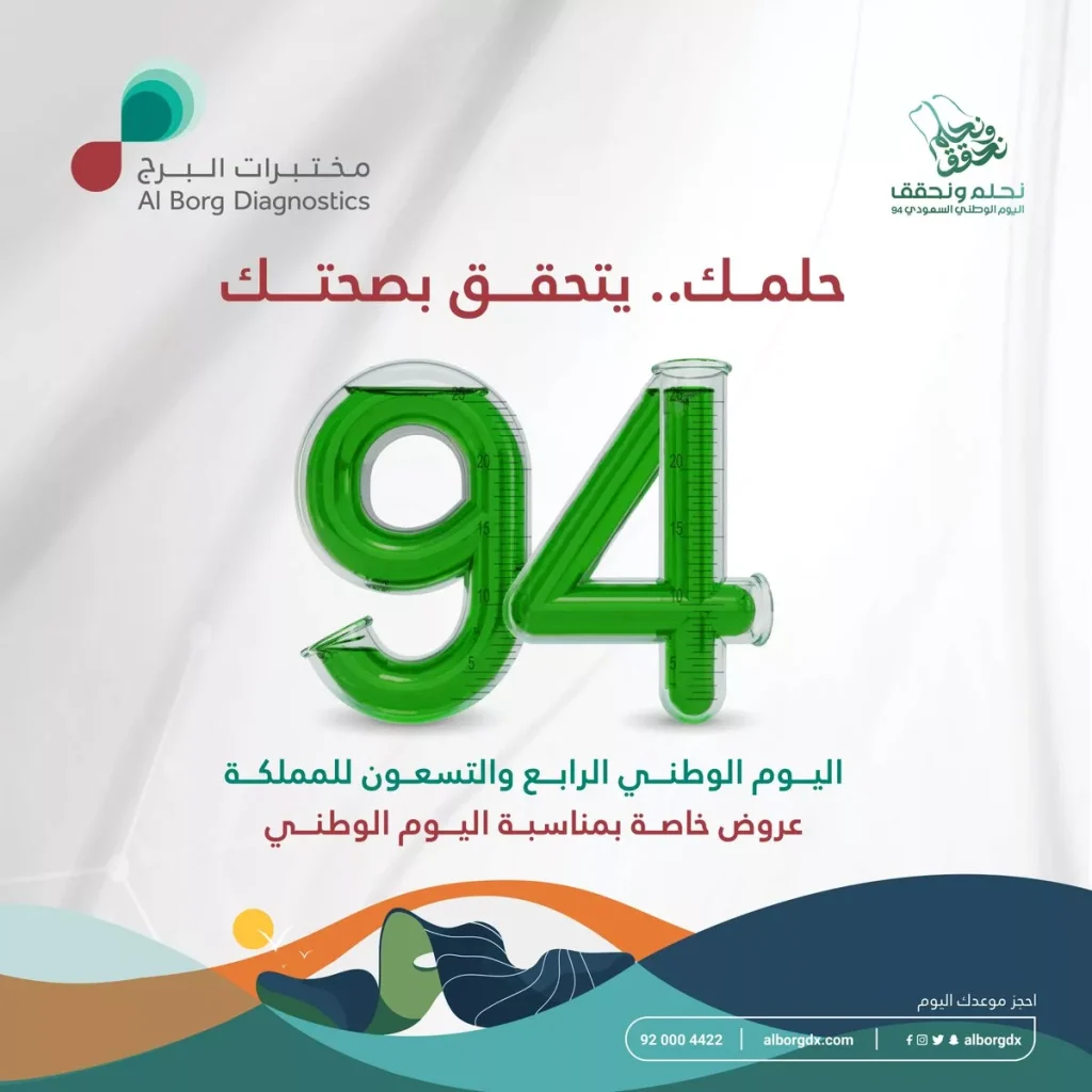 بمناسبة اليوم الوطني الرابع والتسعين للمملكة العربية السعودية، يسرنا أن نوفر لكم احدث العروض المقدمة من مختبرات البرج، رواد التشخيص الطبي وأكبر سلسلة مختبرات في السعودية التي تضم 75 مختبراً. ة ، وخدمات دقيقة وسريعة يقدمها فريقنا المتميز من الخبراء، لتحقيق حلمك بصحتك.
