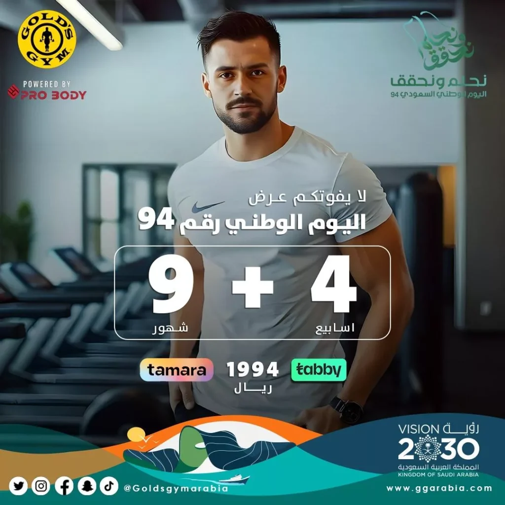 عرض جولدز جيم بمناسبة اليوم الوطني 94 يقدم فرصة فريدة و يتيح العرض اشتراكًا مميزًا يتضمن فترة طويلة من التدريب المكثف والمرافق المتطورة و يتميز بمرافقه المتقدمة ومدربيه المحترفين،