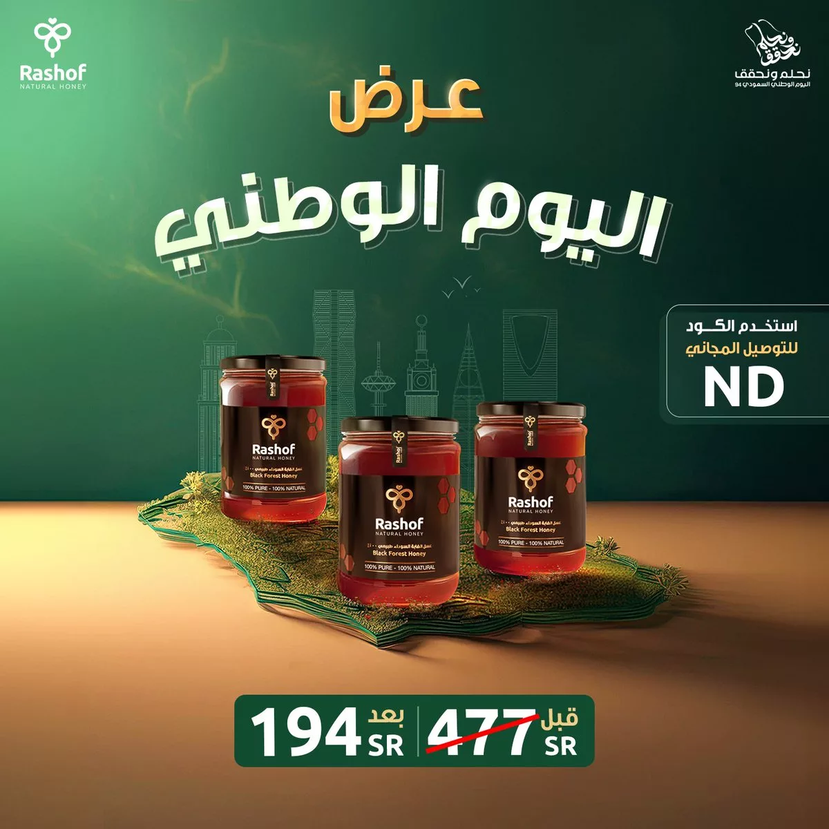 بمناسبة اليوم الوطني السعودي 94 تقدم لكم رشوف عرضاً مميزاً لا يُفوت! احتفلوا معنا بهذه المناسبة العظيمة واستمتعوا بأقوى العروض على منتجات العسل الطبيعية. نقدم لكم عرضًا استثنائيًا على عسل الغابة السوداء، وهو معروف بجودته العالية وفوائده الصحية المذهلة.