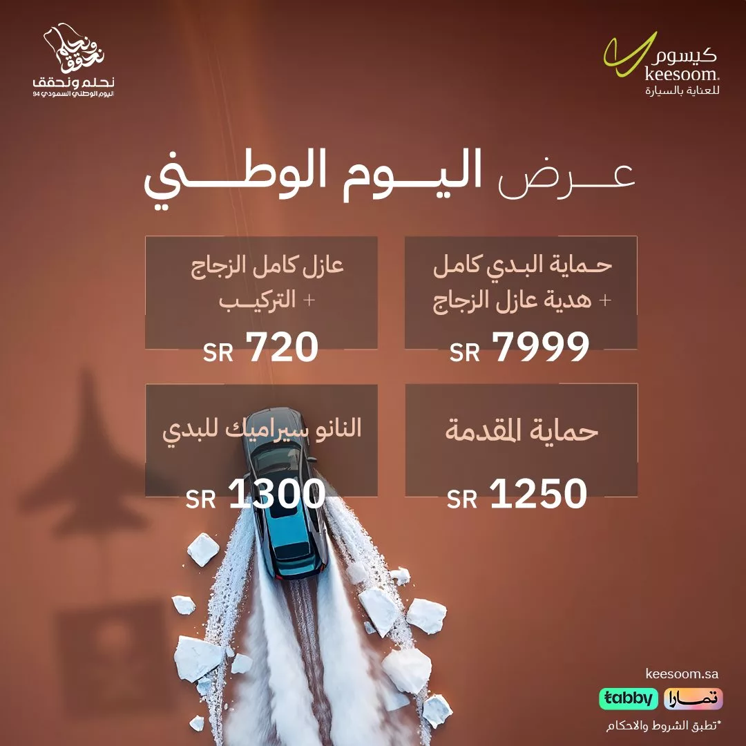 يسرنا أن نقدم لكم عروضًا مميزة بمناسبة اليوم الوطني، الذي يأتي حاملاً معه العزة والفخر بمملكتنا العزيزة. احتفالاً بهذه المناسبة، تقدم كيسوم للعناية بالسيارة مجموعة من العروض الاستثنائية للحفاظ على جمال ورونق سيارتكم.