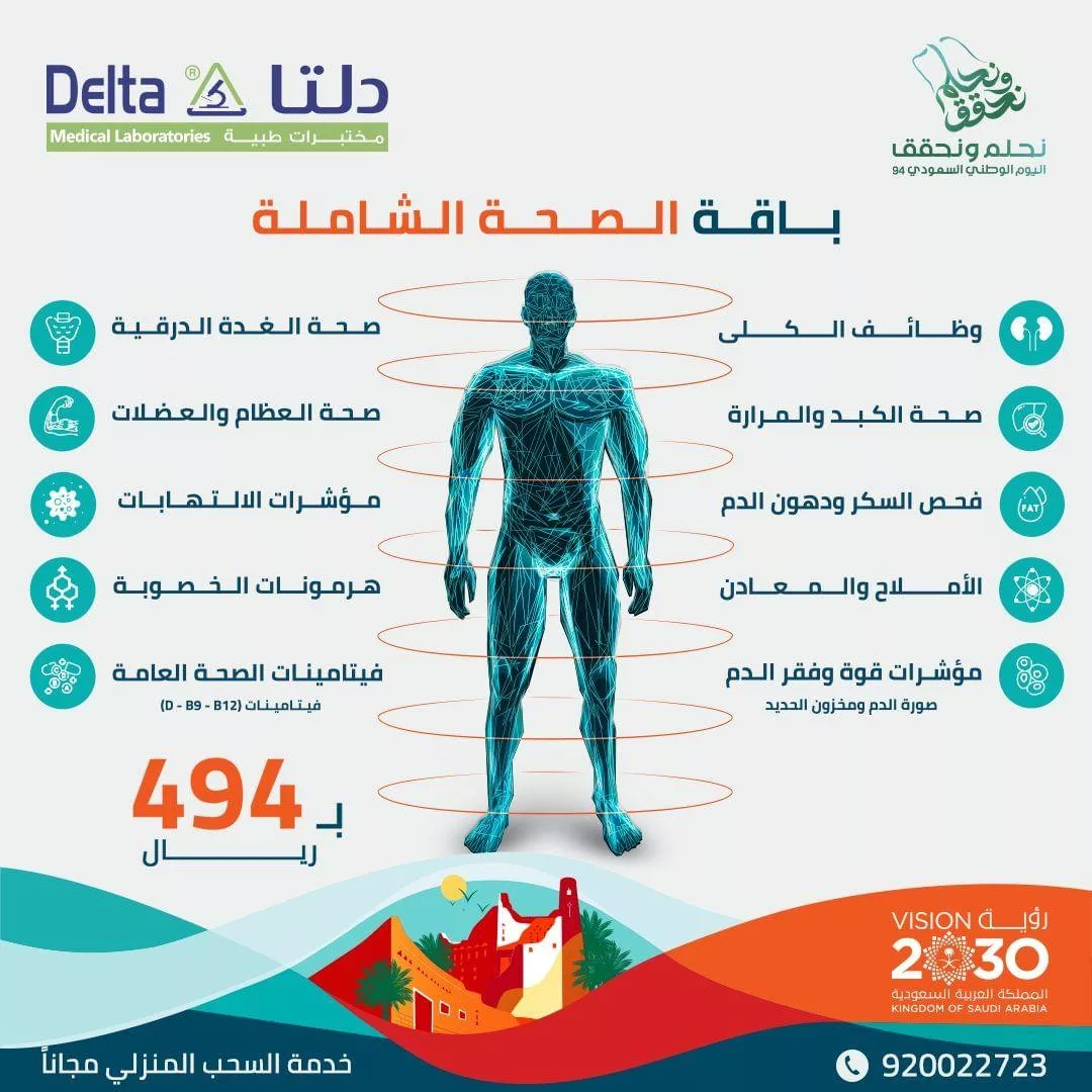 تُقدم عروض اليوم الوطني بباقة الفحص الشامل لأهم وظائف الجسم بخصم مميز، مع توفير خدمة السحب المنزلي مجاناً تابعونا لمعرفة كل جديد عن عروض اليوم الوطني 2024