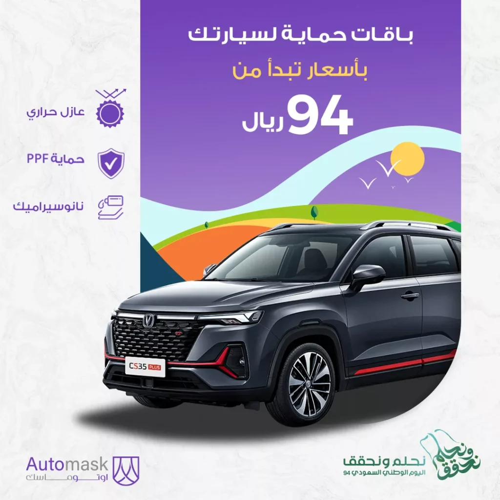 تقدّم شركة أوتوماسك بمناسبة الاحتفال باليوم الوطني السعودي 94 عرضا مميزا يتيح لك حماية أجزاء سيارتك بأفضل الباقات والأسعار، مع خصومات رائعة على العازل الحراري، والحماية الكاملة، والنانوسيراميك طوال شهر سبتمبر.