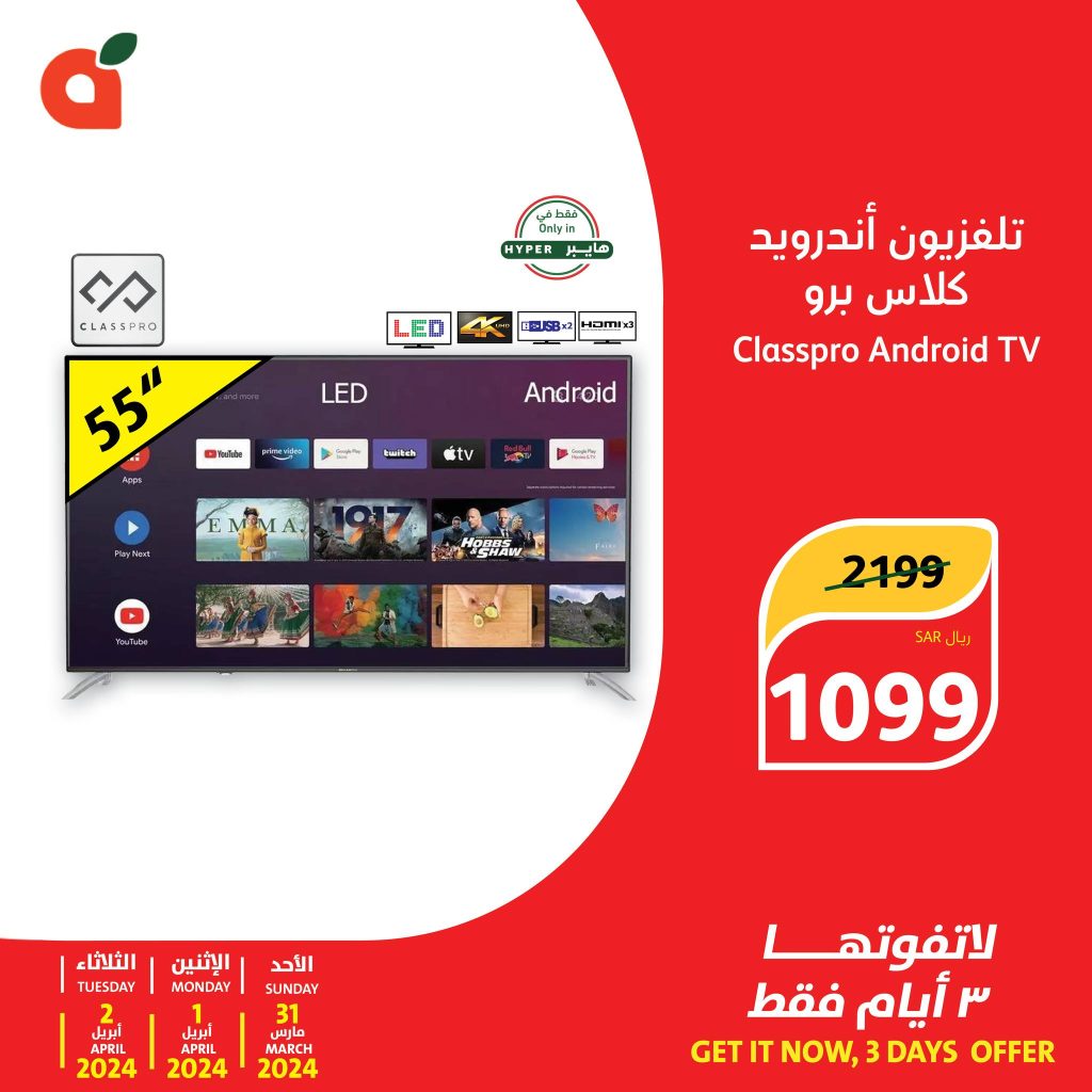 - سعر تلفزيون اندرويد كلاس برو – 55 بوصة بـ 1.100 ريال سعودي