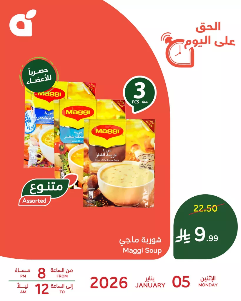 من بين أبرز عروض بنده السعودية الاثنين 5 يناير 2026، يبرز عرض شوربة ماجي الحصري كأحد العروض المميزة التي لا يمكن تفويتها. يقدم بنده 3 حبات من شوربة ماجي بسعر 10 ريالات سعودية فقط. هذا العرض يعتبر فرصة رائعة لتخزين شوربة ماجي، والتي تعتبر من المكونات الأساسية في العديد من الأطباق الرمضانية. شوربة ماجي تتميز بطعمها اللذيذ وسهولة تحضيرها، مما يجعلها خياراً مثالياً لتحضير وجبات الإفطار والسحور.