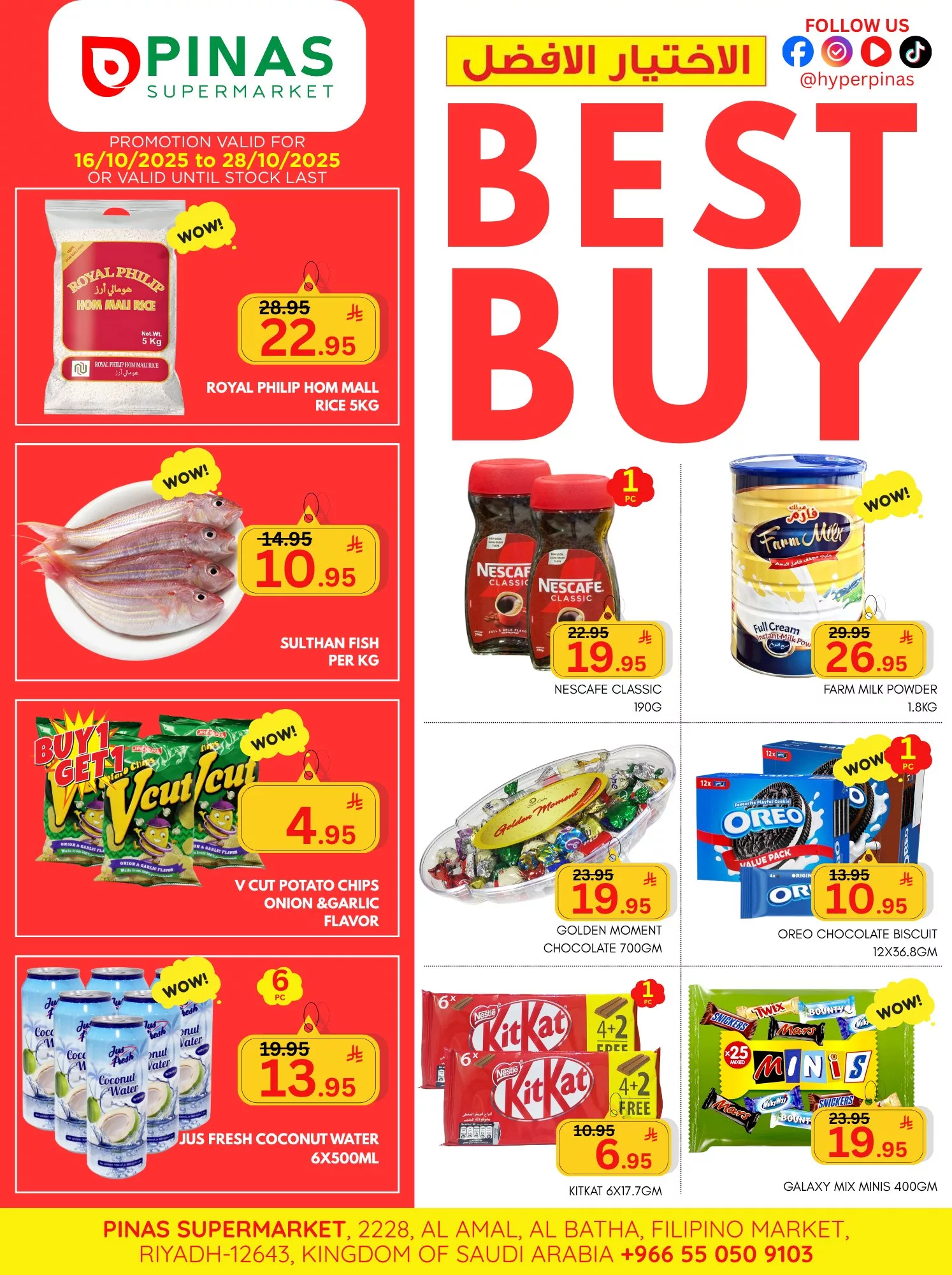 عروض بيناس هايبر الرياض الأسبوعية الأربعاء 30 ربيع الآخر 1447هـ تحتوي على خصومات كبيرة على الأجهزة المنزلية مثل أفران الطبخ الذكية وأجهزة القهوة وأجهزة تحضير العصائر والمكانس الكهربائية بالإضافة إلى عروض على الأغذية من العصائر والمخبوزات والمعلبات والمشروبات الغازية والشوكولاتة