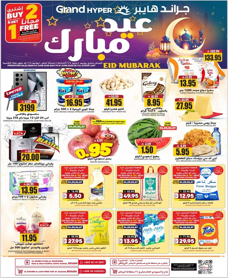 عروض جراند هايبر الرياض الأسبوعية الأربعاء 8/12/1446هـ تقدم تخفيضات على اللبن بنكهات الفواكه والمعلبات مثل الطماطم المطبوخة والفطر والمشروم والزيتون بالإضافة إلى العصائر بنكهات المانجو والعنب والتوت والمياه بنكهات الأعشاب والليمون والمربى بنكهات موسمية مثل البرتقال والفراولة والخلطات الجاهزة للأطباق السريعة