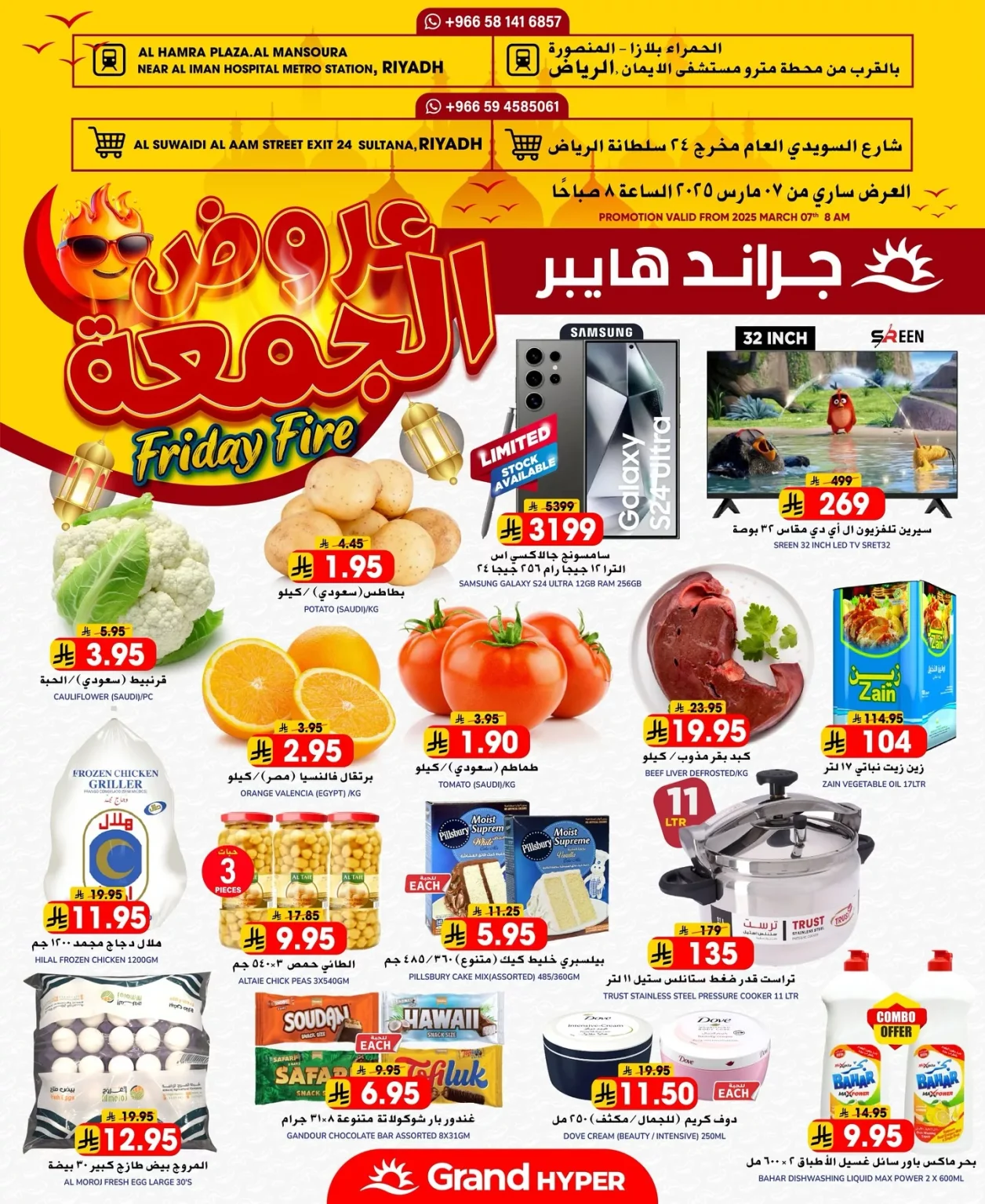 تشهد عروض جراند هايبر الرياض الجمعة 7 مارس 2025 تخفيضات مذهلة على مختلف المنتجات مما يجعلها فرصة رائعة للتسوق بأسعار مخفضة و تشمل العروض خصومات على المواد الغذائية الأساسية مثل الأرز و الحليب والزيوت بالإضافة إلى المنتجات المجمدة مثل الدجاج والفطائر.