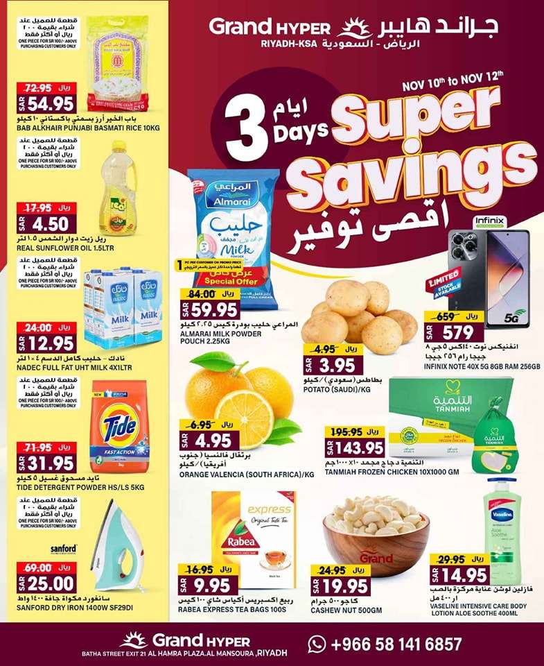 عروض جراند هايبر الرياض الأحد 10 نوفمبر 2024 تميزت بعرض مجموعة واسعة من السلع الاستهلاكية الأساسية بأسعار مخفضة حيث تشمل هذه العروض تخفيضات على الأرز البسمتي و الزيوت النباتية مثل زيت الذرة وزيت دوار الشمس إضافة إلى الشاي والقهوة ومجموعة متنوعة من البسكويت