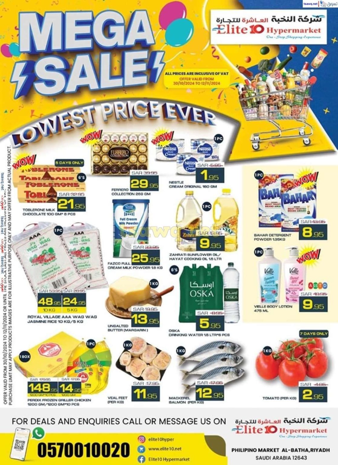 تقدم شركة النخبة العاشرة سلسلة من التخفيضات الكبرى التي تضم مجموعة واسعة من المنتجات بأسعار تنافسية لا مثيل لها و تتنوع هذه العروض لتشمل السلع الغذائية الأساسية المنتجات المجمدة بالإضافة إلى مستلزمات المنزل اليومية مثل منتجات التنظيف والعناية الشخصية و توفر الشركة خصومات كبيرة على المنتجات التي يحتاجها