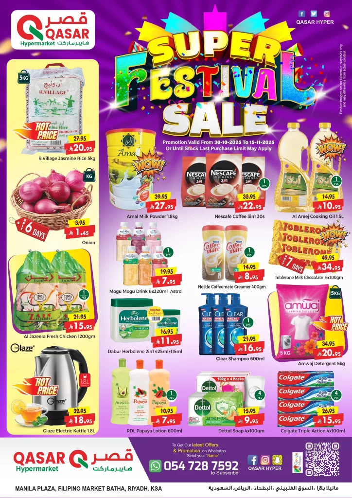 عروض قصر هايبر ماركت الخميس 30-10-2025 و بتشمل تشكيلة من المنتجات الغذائية والاستهلاكية منها الشوكولاتة والحلويات على أنواعها و القهوة والشاي والأرز و تمتد لتشمل الخضروات والفواكه الطازجة مثل التفاح والبصل والجزر والذرة مع عروض مميزة للأسماك منها التونة والماكريل وحتى منتجات المنظفات باقل الاسعار