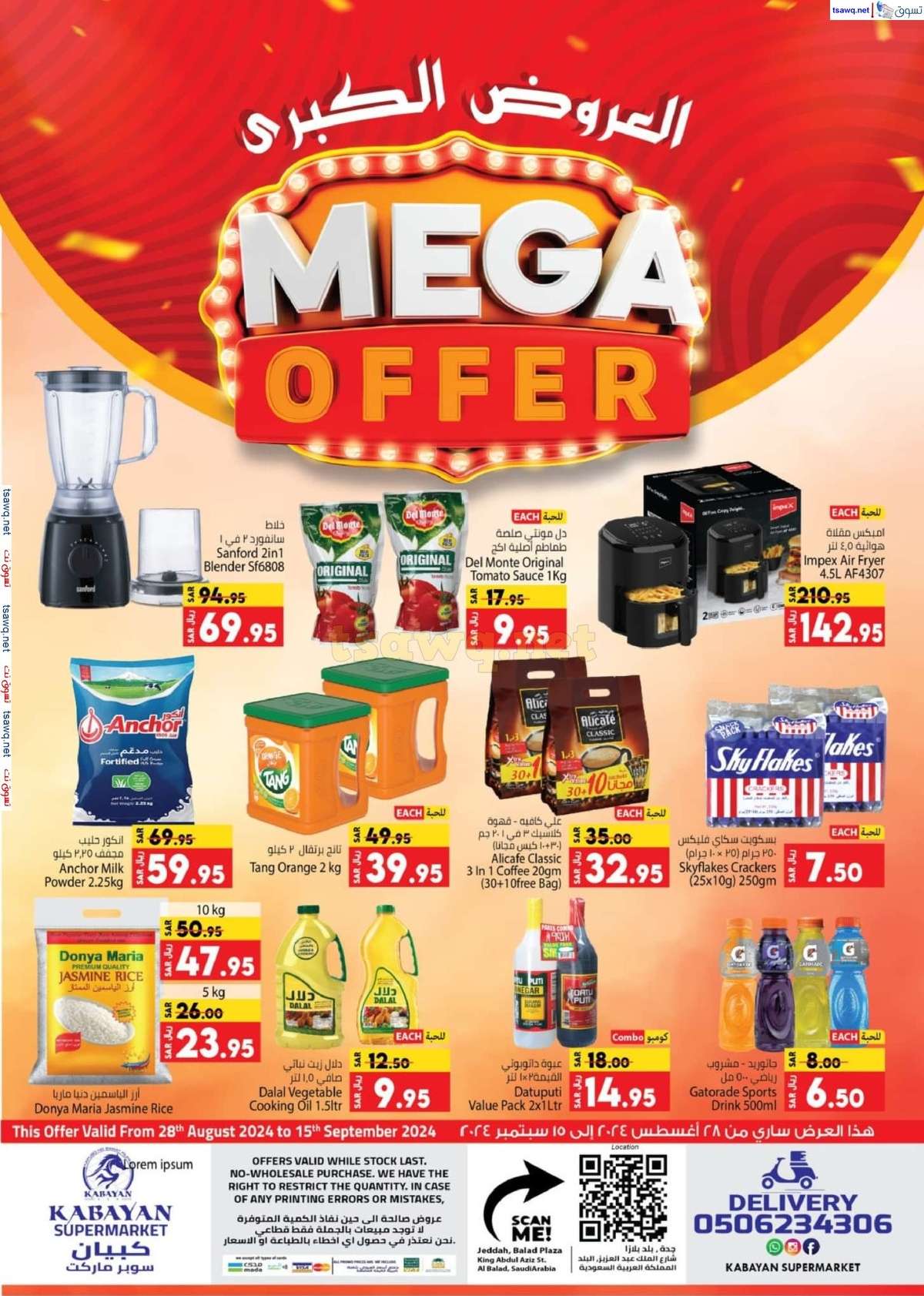 تقدم سوبرماركت كابايان في السعودية عروضاً مميزة تبدأ من يوم الأربعاء 28 أغسطس 2024 وحتى 15 سبتمبر 2024. تتنوع العروض لتشمل مجموعة واسعة من المنتجات، بما في ذلك الأجهزة الكهربائية مثل الخلاطات والقلايات الهوائية، بالإضافة إلى المواد الغذائية الأساسية مثل الأرز، الحليب البودرة، ومعجون الطماطم.