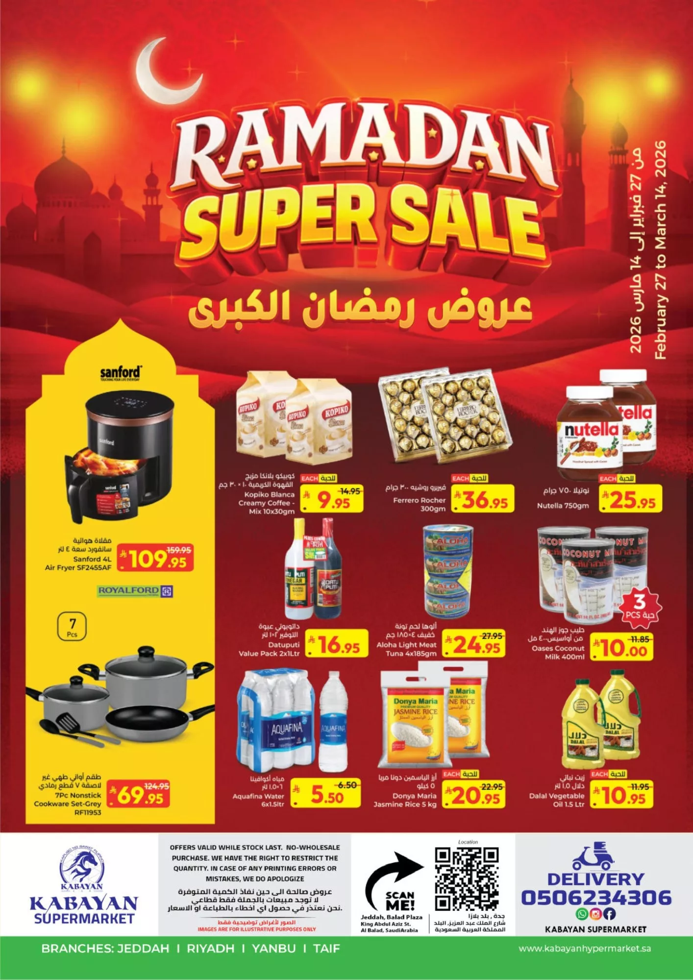 لا تفوتوا فرصة الاستفادة من هذه التخفيضات الاستثنائية! زوروا أقرب فرع لكم من كبايان سوبر ماركت واستمتعوا بتجربة تسوق مليئة بالتوفير والمتعة. تذكروا، العروض سارية حتى 14 مارس 2026.