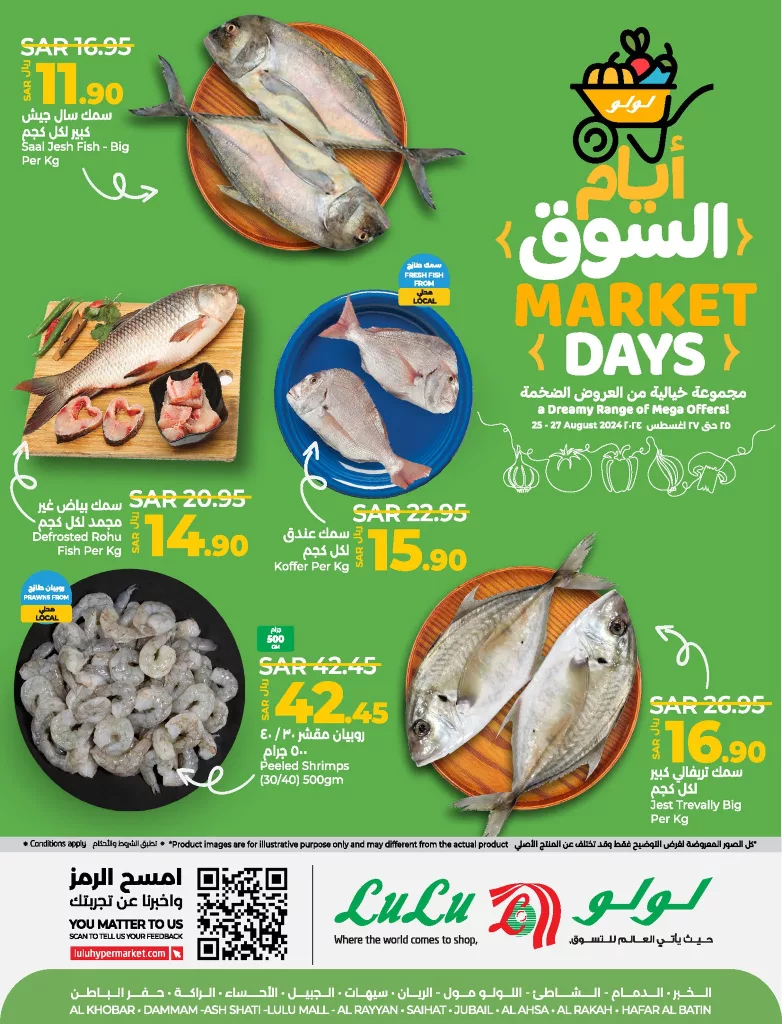 عروض لولو الأحساء الأحد 25 أغسطس 2024 تقدم لكم مجموعة واسعة من الخصومات على المنتجات الطازجة والمأكولات البحرية المتنوعة. تشمل العروض تخفيضات على أنواع مختلفة من الأسماك مثل سمك السلمون النرويجي والروبيان المطبوخ، مما يمنح العملاء فرصة للاستمتاع بوجبات بحرية لذيذة بأسعار مغرية.
