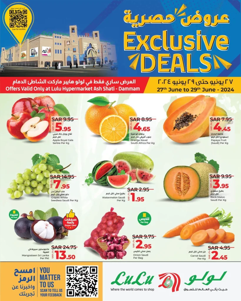 عروض لولو الدمام، الخميس 27 يونيو 2024، توفر لكم خصومات رائعة على تشكيلة واسعة من المنتجات الغذائية والمنزلية. تسوقوا من بين مجموعة متنوعة من الفواكه والخضروات الطازجة، اللحوم والألبان بأفضل الأسعار. استمتعوا بتجربة تسوق مميزة واكتشفوا الجودة العالية التي يقدمها لولو. بالإضافة إلى ذلك، تشمل العروض تخفيضات على المنتجات المجمدة والمعلبة،