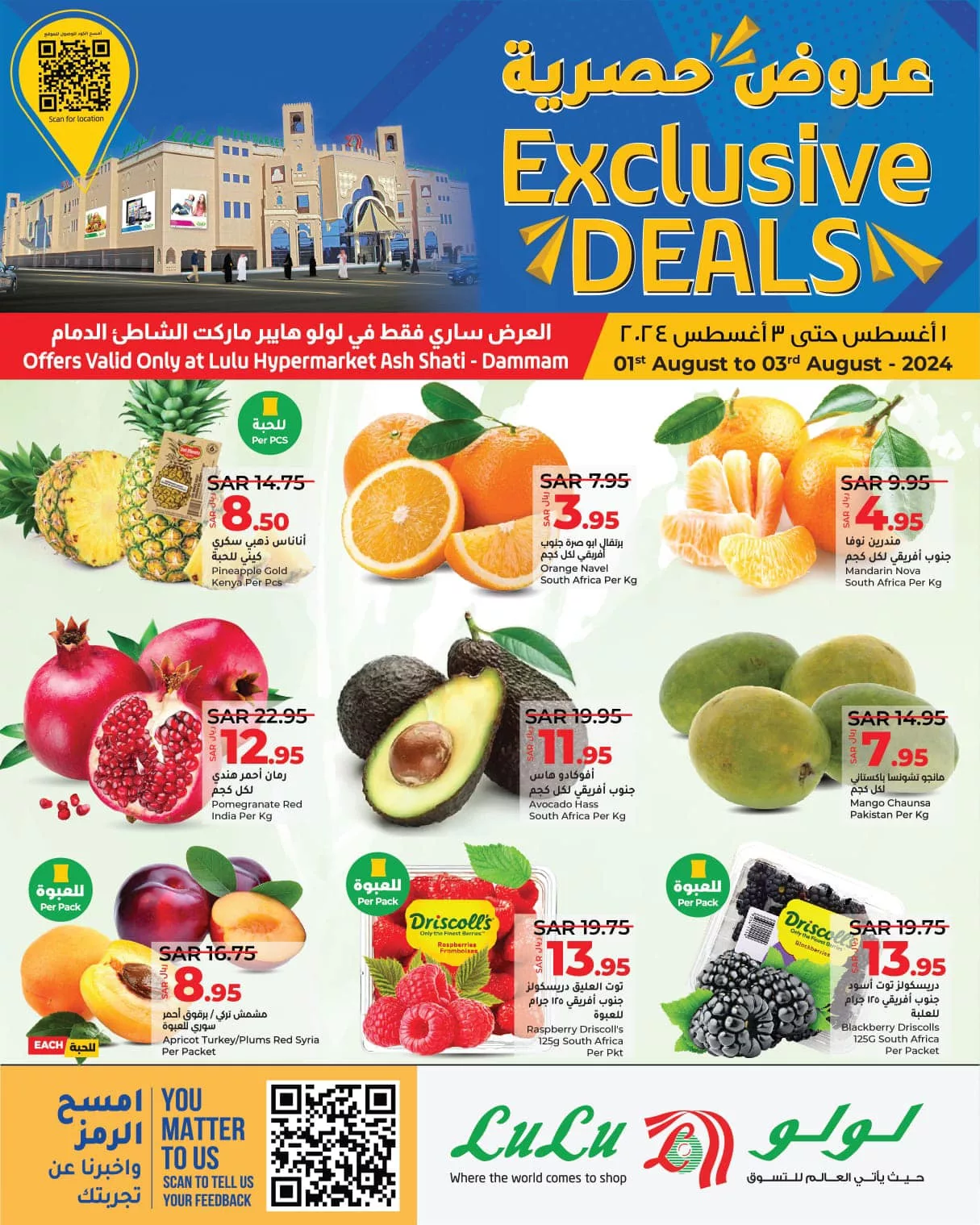 عروض لولو الدمام الخميس 1 أغسطس 2024 تقدم مجموعة متميزة من التخفيضات على المنتجات الطازجة والمعبأة. تشمل هذه العروض تخفيضات كبيرة على الفواكه والخضروات الطازجة مثل الأناناس والبرتقال والرمان والأفوكادو. بالإضافة إلى ذلك، هناك تخفيضات مميزة على الأجبان والألبان،