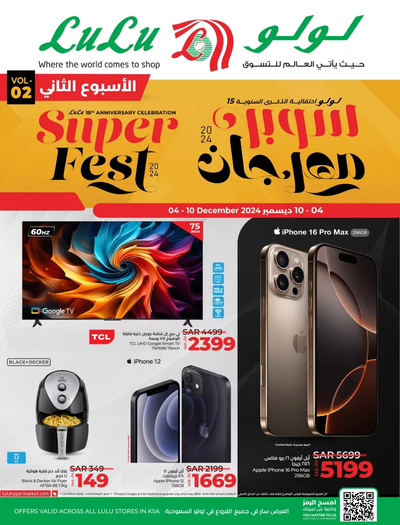 عروض لولو السعودية جميع الفروع الاربعاء 4-12-2024 تستمر في تقديم خصومات استثنائية بمناسبة الاحتفال بالذكرى السنوية الـ15 و تشمل التخفيضات مجموعة واسعة من المنتجات الإلكترونية وأجهزة المنزل والهواتف المحمولة حيث يمكنك الحصول على أحدث التلفزيونات الذكية بتقنيات متقدمة وأسعار منافسة