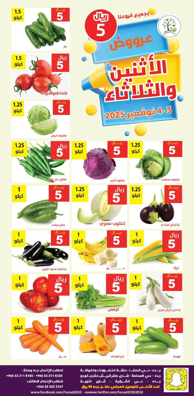 عروض حصاد البساتين الاثنين 3 نوفمبر 2025 تقدم مجموعة من الخضروات الطازجة مثل البطاطس والبصل الأبيض والباذنجان الرومي والجرجير والسبانخ و توفر كمان تشكيلة كبيرة من الفواكه مثل البرتقال أبو صرة والأناناس والجوافة والفواكه الموسمية مثل العنب الأسود والأبيض وغيرها من المنتجات و باقل الاسعار فقط تابعونا ليصلكم كل جديد