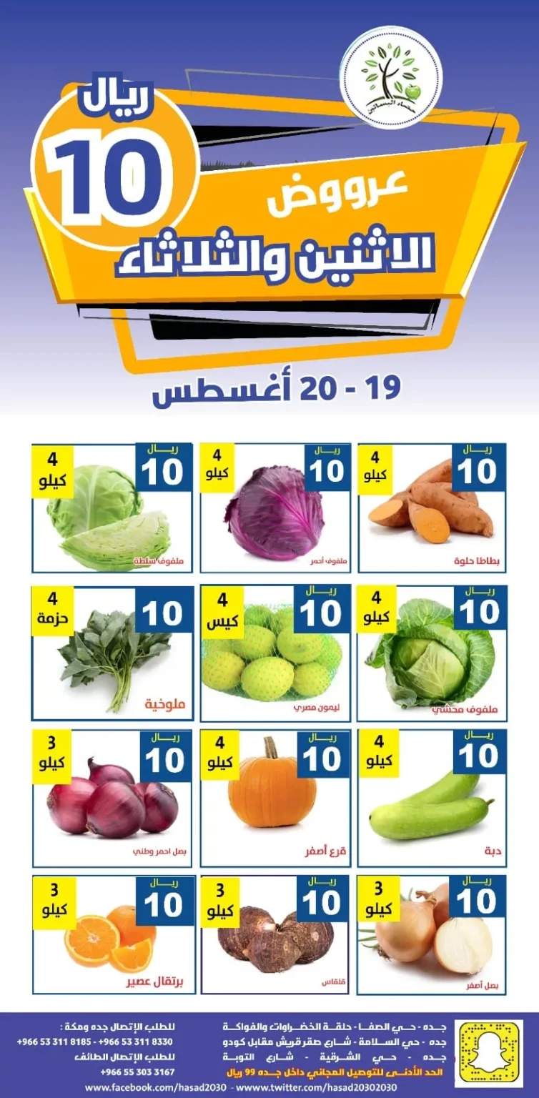 العرض يتضمن مجموعة مختارة من الخضروات الطازجة مثل البطاطس والطماطم والكوسة، إلى جانب الفواكه المتنوعة مثل البرتقال، التفاح، والعنب. هذا التنوع الكبير يتيح لك إمكانية تجهيز جميع أنواع الأطباق الطازجة والصحية لعائلتك، وكل ذلك بأسعار تبدأ من 10 ريال فقط لكل صنف،