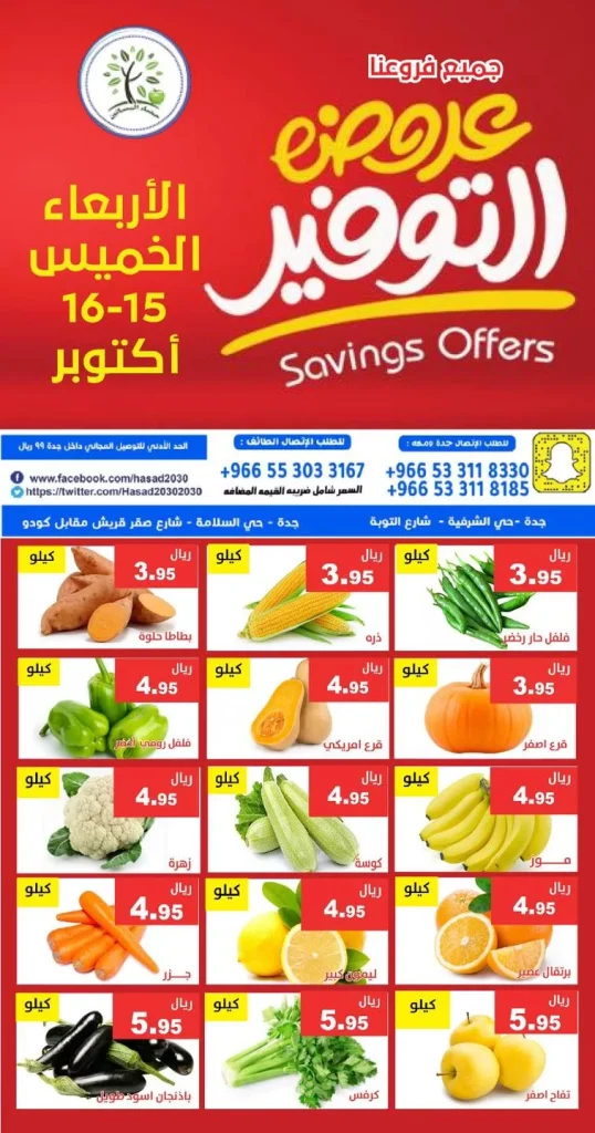 عروض مؤسسة حصاد البساتين ليوم الاربعاء 15 أكتوبر 2025 بتقدم مجموعة كبيرة من الخضار الطازج منها الباذنجان والخيار والملوخية والملفوف والبطاطس والبصل بأنواعه والبنجر والقرع والكوسة والجزر والليمون والكرفس والتفاح الأصفر و بتوفر كمان أصناف الفواكه الموسمية مثل البابايا والرمان والعنب بأنواعه والتفاح الأحمر