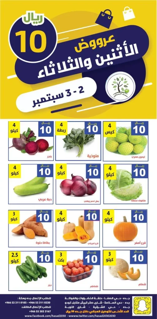 عروض مؤسسة حصاد البساتين الاثنين 2 سبتمبر 2024 تقدم تشكيلة رائعة من الخضروات والفواكه بأسعار منافسة جدًا، حيث يمكنك الحصول على 4 كيلو من البنجر، أو الربطة من الملوخية، أو كيس من الليمون العصير، وكل ذلك مقابل 10 ريال فقط.