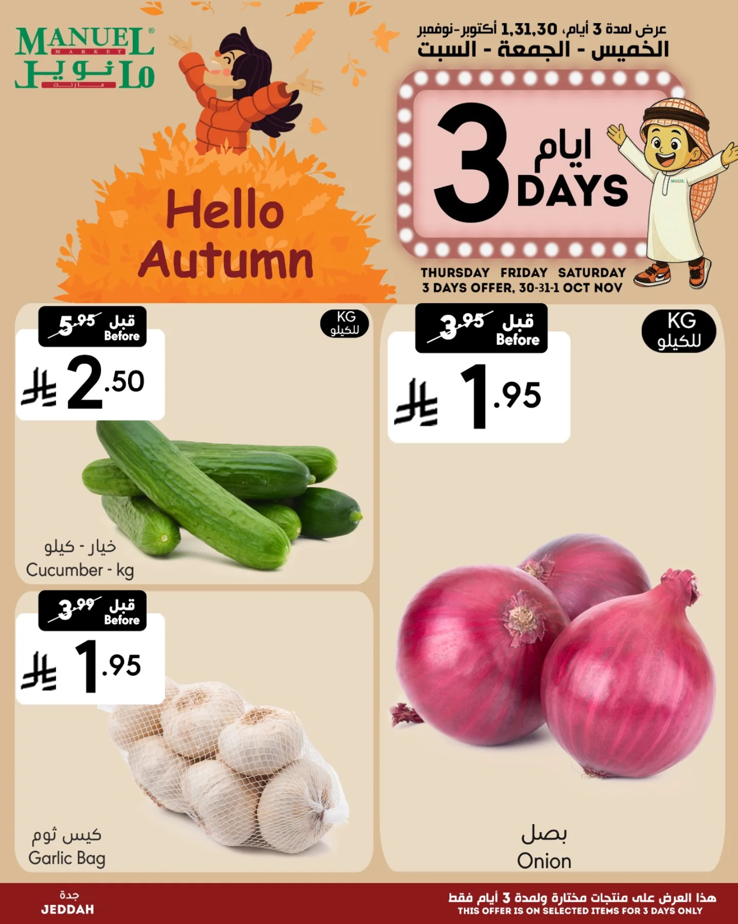 عروض مانويل جدة الخميس 30 أكتوبر 2025 تقدم مجموعة مختارة من المنتجات الطازجة تشمل الخيار والبصل والثوم في عرض حصري لمدة 3 ايام و باقل الاسعار كما يوفر موقعنا العديد من عروض الهايبر ماركت منها عروض بنده و عروض اسواق العثيم و غيرها من المتاجر تابعونا ليصلكم كل جديد علي موقعكم عروض توداي .