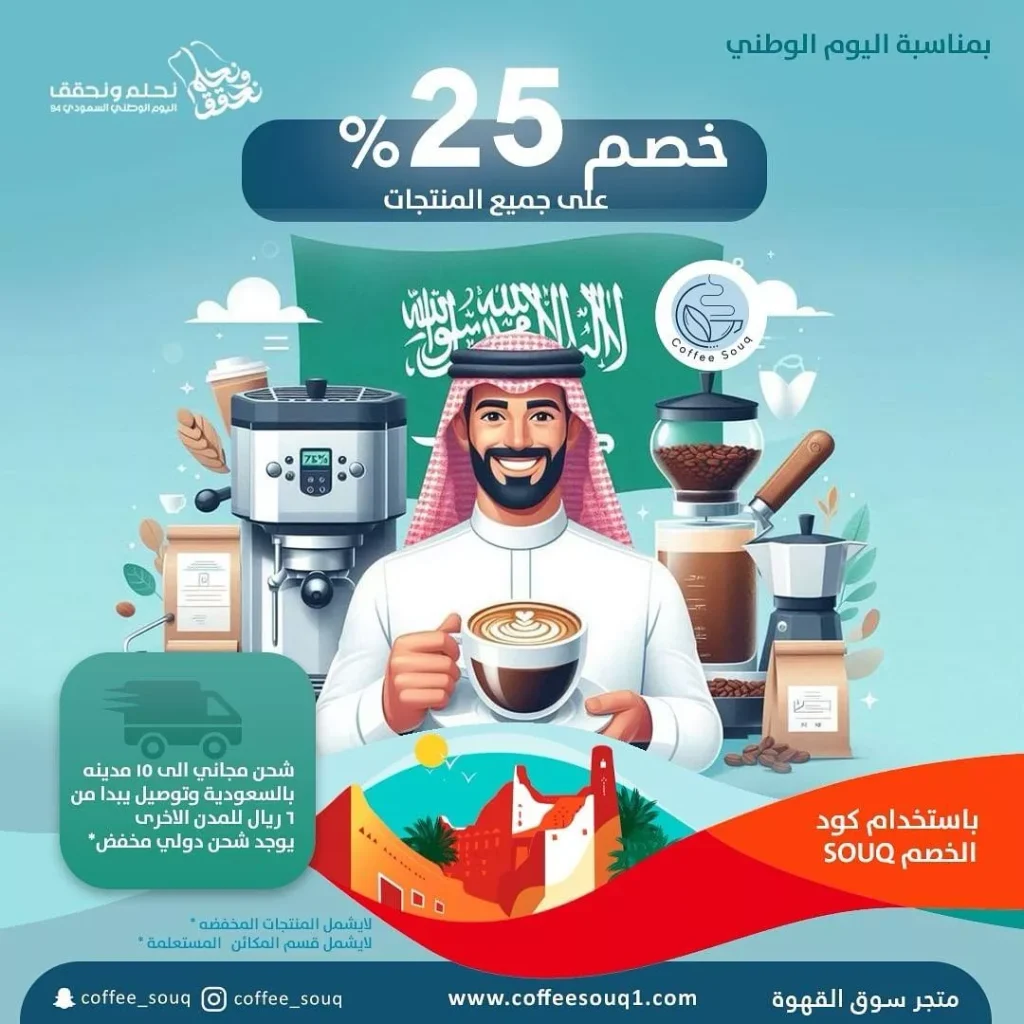 يقدم متجر سوق القهوة مع اقتراب الاحتفال باليوم الوطني السعودي لعام 2024، مجموعة مميزة من الخصومات والعروض الخاصة. من أبرز العروض المتاحة هو خصم 25% على كافة المنتجات الموجودة في المتجر، مما يوفر فرصة رائعة لعشاق القهوة للحصول على الأجهزة والأدوات في منازلهم
