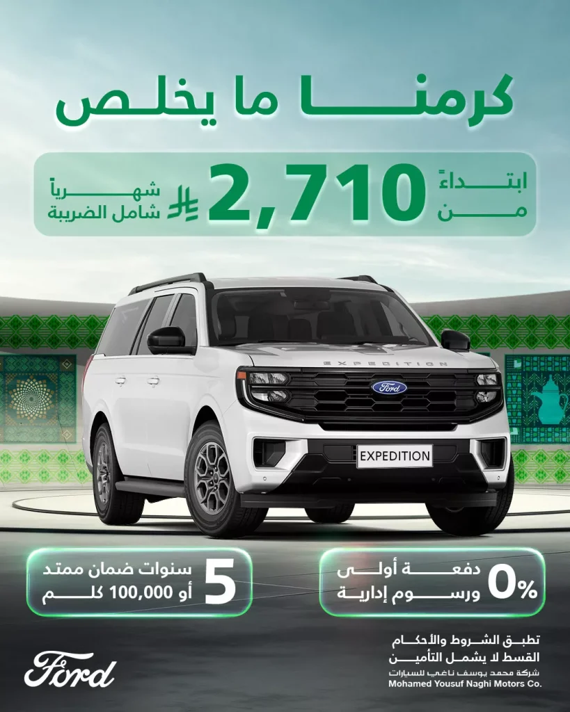 عروض محمد يوسف ناغي للسيارات تقدم عروض متنوعة علي السيارات العائلية تشمل فورد إكسبيديشن و أيضا سيارات فورد تيريتوري تيتانيوم كاملة المواصفات بدون دفعة اولي او رسوم ادارية و غيرها من المميزات و باقل قسط شهري ابقوا معنا ليصلكم كل جديد عن عروض السيارات في السعودية .