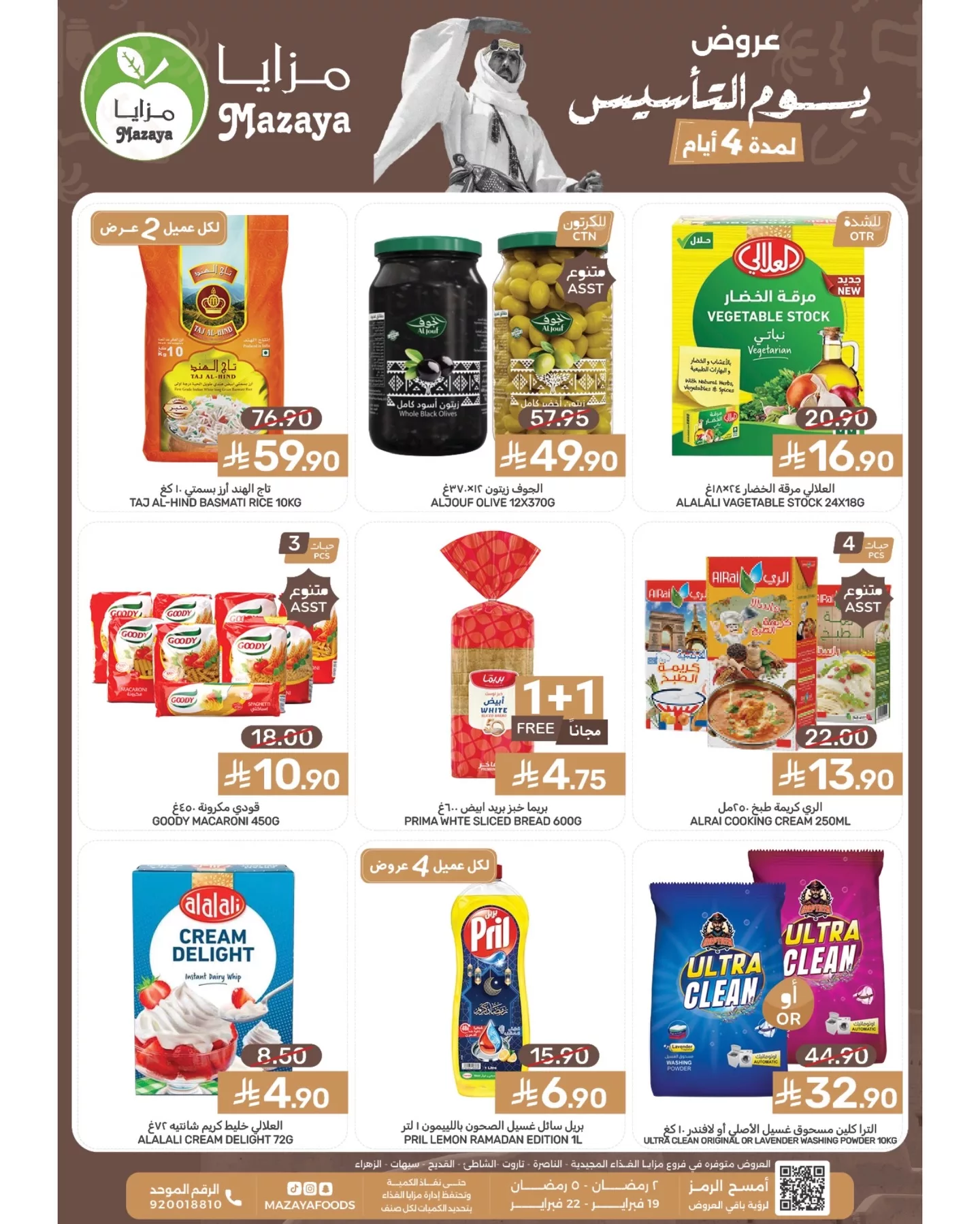تُعدّ المملكة العربية السعودية بفخر مناسبة عظيمة، وهي يوم التأسيس، الذي يجسّد حقبة تاريخية ملهمة. وكعادتها، تُبادر “مزايا الغذاء” بتقديم أروع الاحتفالات بهذه الذكرى الغالية، حيث تطلق سلسلة من العروض الاستثنائية على المواد الغذائية والسلع الاستهلاكية، مدتها أربعة أيام حافلة بالتوفير. تبدأ هذه العروض المميزة في 19 فبراير 2026 وتستمر حتى 22 فبراير 2026، لتمنحكم فرصة ذهبية للتسوق بأسعار لا تُصدق.