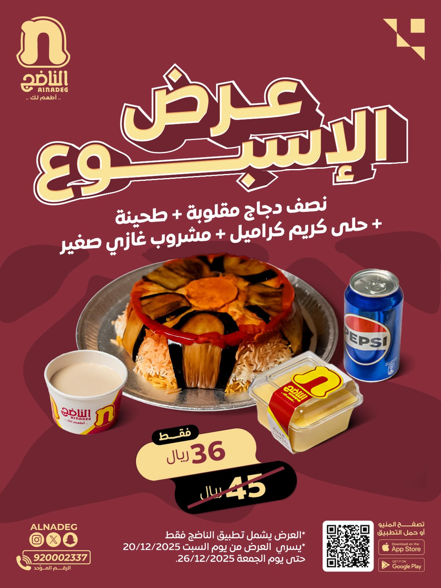 يعتبر عرض الناضج الحالي محط أنظار الكثيرين، وذلك لما يقدمه من قيمة رائعة. العرض يتضمن وجبة نصف دجاج مقلوبة الشهية، بالإضافة إلى طبق الطحينة الكريمية، وقطعة حلا كريم كراميل اللذيذة لإكمال الوجبة، ومشروب منعش. كل هذا بسعر لا يتعدى 36 ريال سعودي فقط! هذا العرض يعد فرصة مثالية لتجربة طبق المقلوبة الشهير من الناضج بأسعار معقولة للغاية، خاصة للعائلات والأصدقاء.