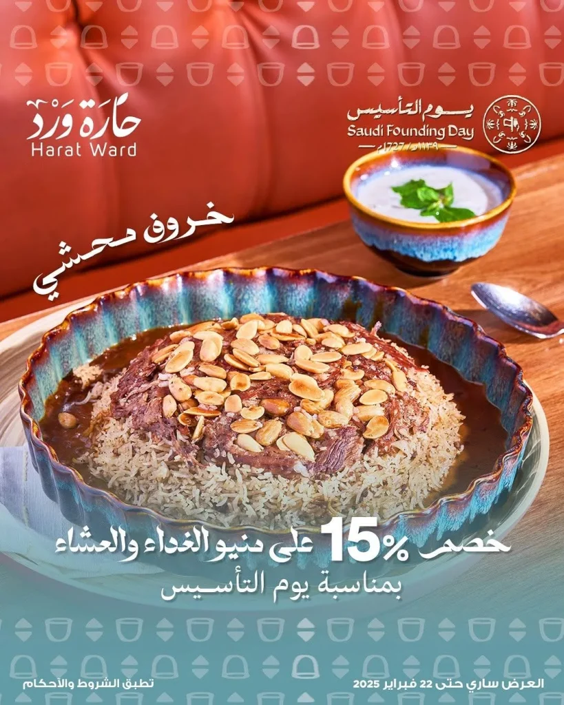 عروض مطعم حارة ورد تقدم لك تجربة استثنائية بمناسبة يوم التأسيس حيث يمكنك الاستمتاع بوجبات أصيلة تحكي قصة المطبخ العربي العريق و استمتع بطبق الخروف المحشي الذي يعد بتوابل مميزة ومكونات طازجة إلى جانب تشكيلة متنوعة من الأطباق التقليدية الغنية بالنكهات لا تفوت هذه الفرصة للاستمتاع بألذ الأطباق