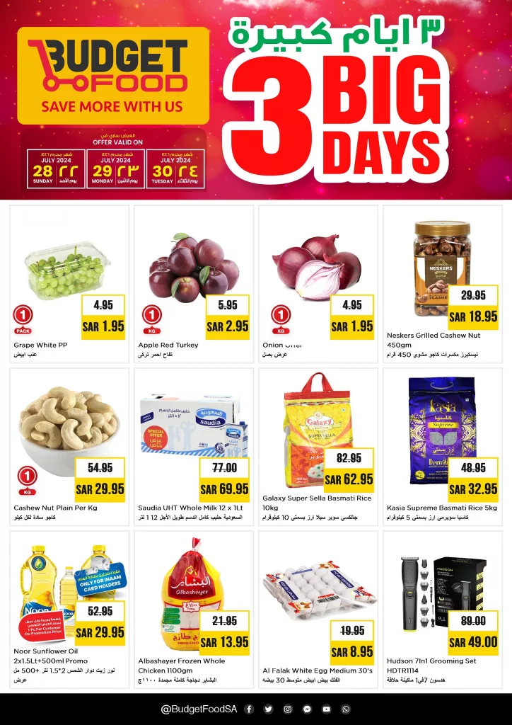 تقدم ميزانية الطعام يوم الأحد 28 يوليو 2024 مجموعة متنوعة من العروض الرائعة على مختلف المنتجات الأساسية التي تحتاجها الأسرة. تشمل هذه العروض تخفيضات مميزة على الفواكه والخضروات الطازجة، المكسرات، الألبان، والحبوب، مما يجعل التسوق أكثر اقتصادية وسهولة.