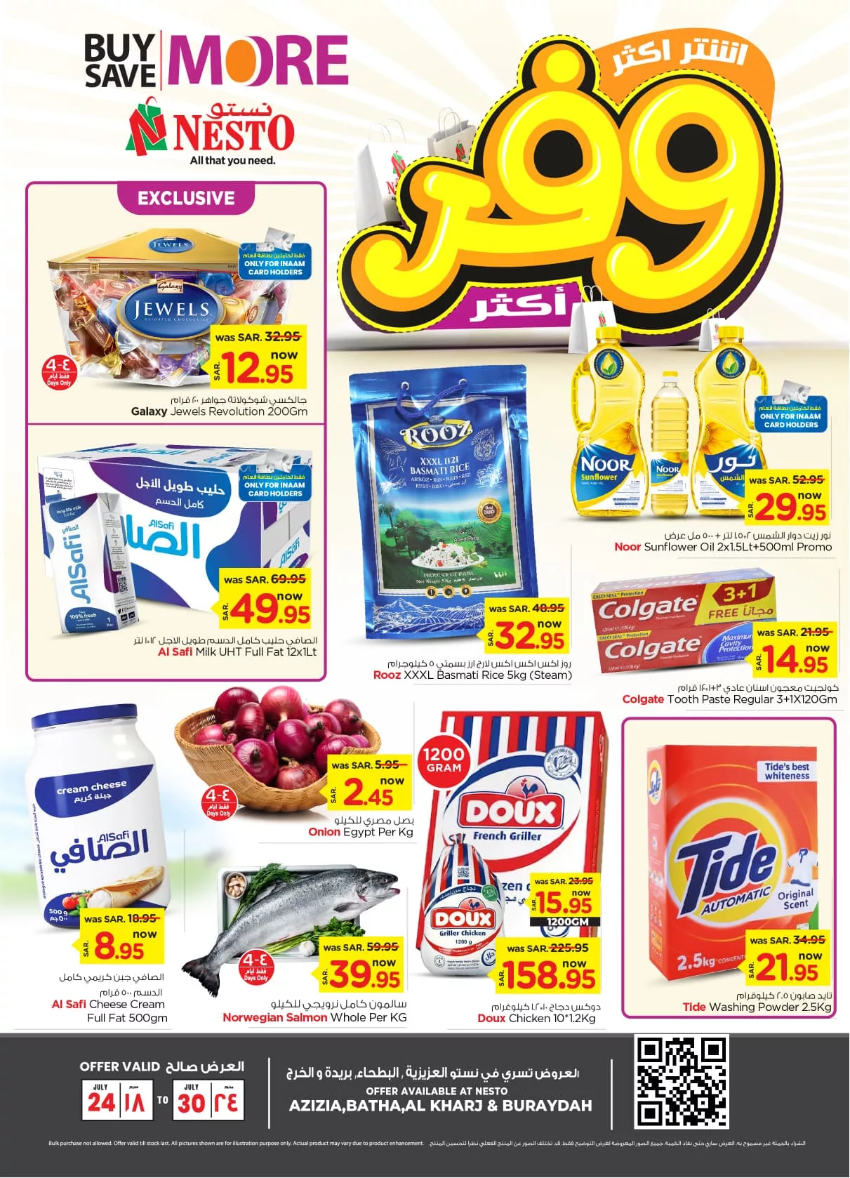 تقدم عروض نستو الأحساء – الأربعاء 24 يوليو 2024 تخفيضات مدهشة على مجموعة متنوعة من المنتجات. يمكن للمتسوقين الاستفادة من عروض كبيرة على المواد الغذائية مثل الأرز، السكر، والزيت، بالإضافة إلى تخفيضات على منتجات الألبان واللحوم الطازجة والفواكه والخضروات.