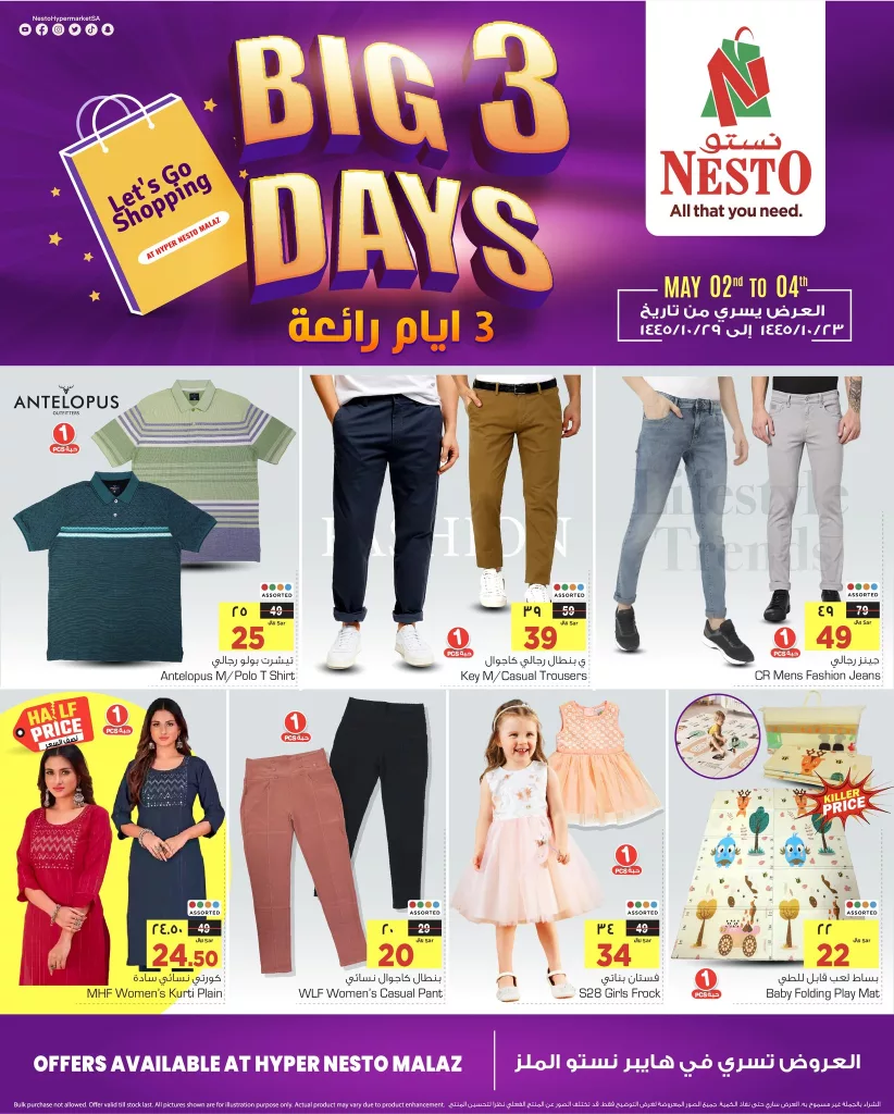 عروض نستو الرياض الويكند على الملابس والأجهزة الكهربائية الخميس 2 مايو 2024 توفر خصومات ممتازة للمتسوقين. تشمل العروض تنزيلات كبيرة على مجموعة متنوعة من الملابس لجميع أفراد الأسرة، من الأزياء الكاجوال إلى الملابس الرياضية، وكذلك الأزياء الرسمية. هذه العروض تجعل نستو الرياض وجهة مثالية لتحديث خزانة الملابس بتكلفة معقولة