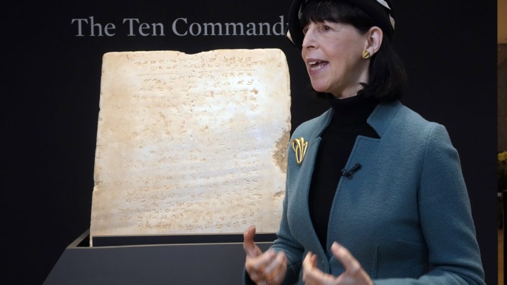 سيتم بيع اللوح الرخامي الذي يبلغ وزنه 155 رطلاً (52 كيلوجرامًا) والمكتوب عليه الوصايا بالخط العبري القديم، بالمزاد العلني في 18 ديسمبر.