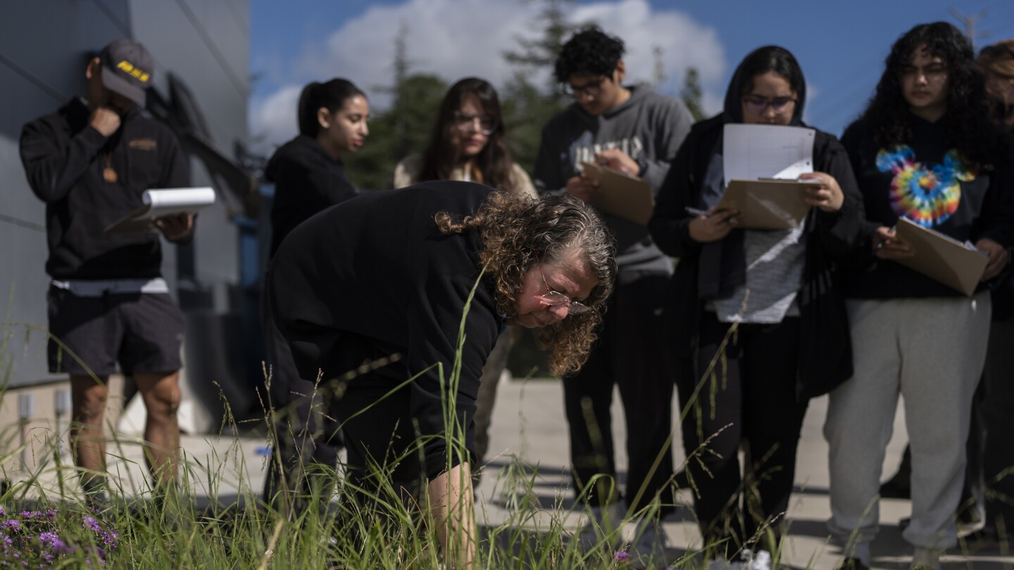 الأستاذ المساعد فيريد ميرموفيتش وطلابها في صف علم الأحياء يزورون دفيئة في حرم كلية ويست لوس أنجلوس في كولفر سيتي، كاليفورنيا، الثلاثاء 12 مارس 2024. (AP Photo/Jae C. Hong)